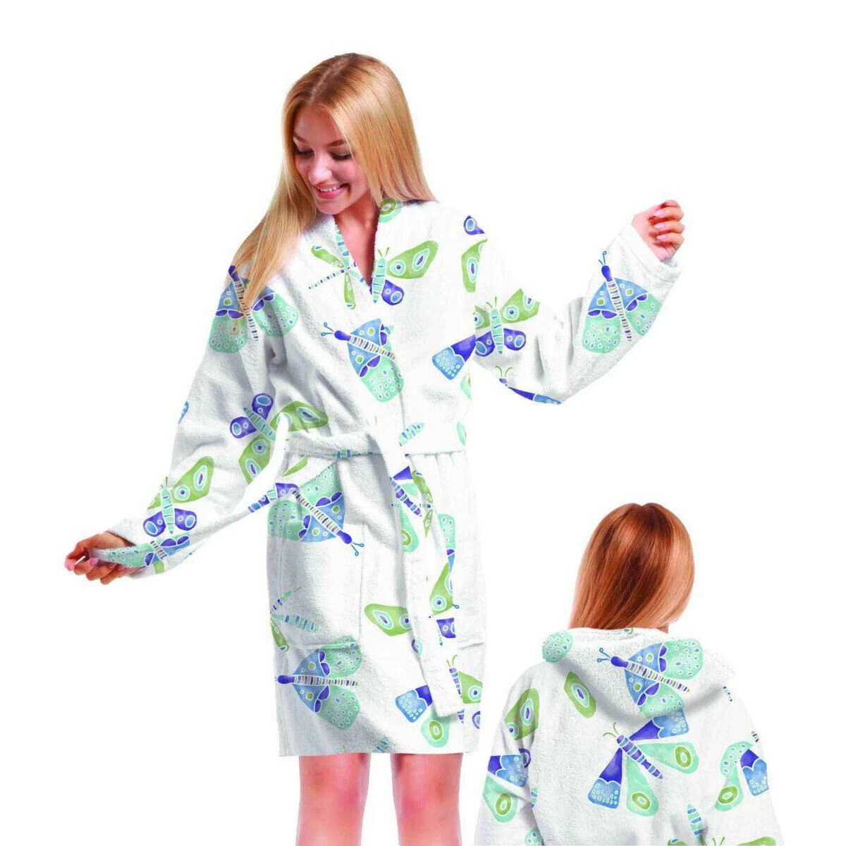 | Dettagli | La confezione contiene un accappatoio da donna Dotato di cappuccio, tasche anteriori e passanti con cintura Motivo stampato con farfalle Da un lato spugna velour cinigliata, dall’altro spugna di cotone a riccio Morbida spugna di puro cotone, altamente assorbente |