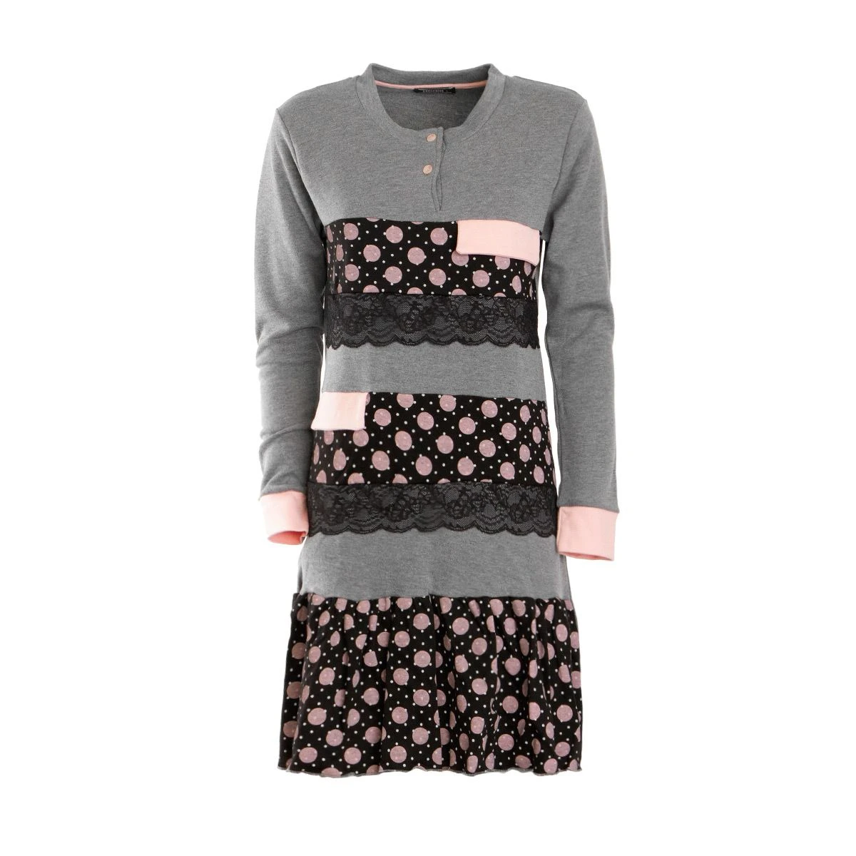 | Dettagli | La confezione contiene una camicia da notte per donna Scollo serafino con bottoncini Polsini in contrasto di colore Volants con motivo a pois posti sulla parte inferiore Applicazioni in pizzo ed in tessuto con motivo a pois Lunghezza media al di sopra del ginocchio Caldo cotone ideale per il periodo invernale Confezionata in una scatola stampata |