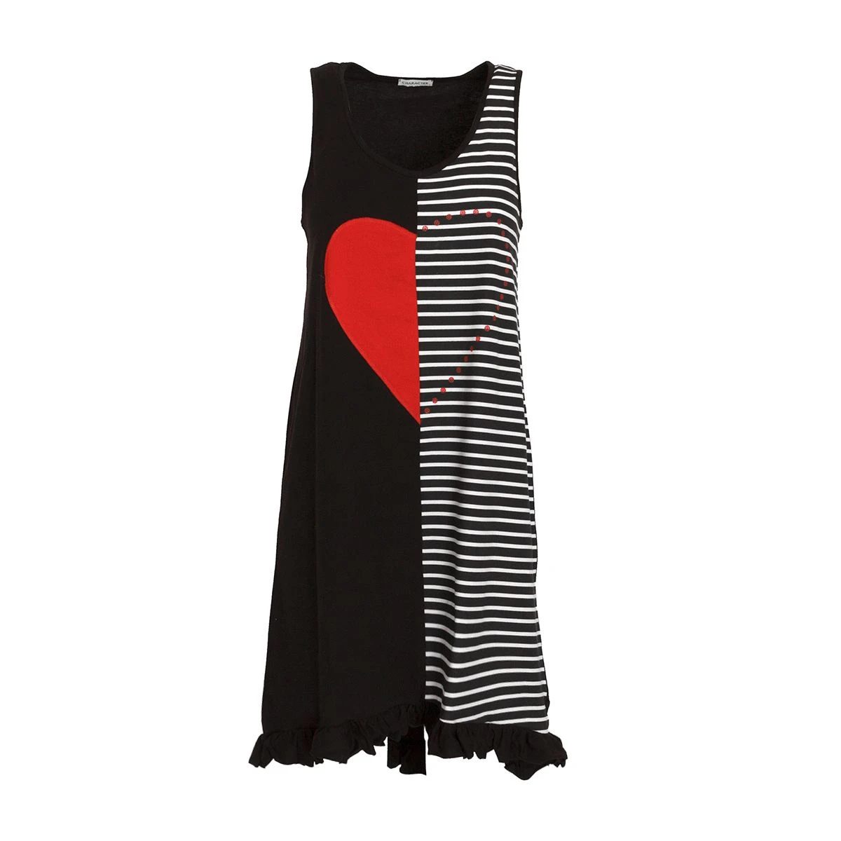 | Dettagli | La confezione una camicia da notte smanicata Stampa centrale con cuore e righe Lunghezza media al ginocchio Estremità inferiore asimmetrica smerlata Jersey di cotone fresco e leggero Utilizzabile anche come vestitino da casa Confezionato in una scatola stampata |