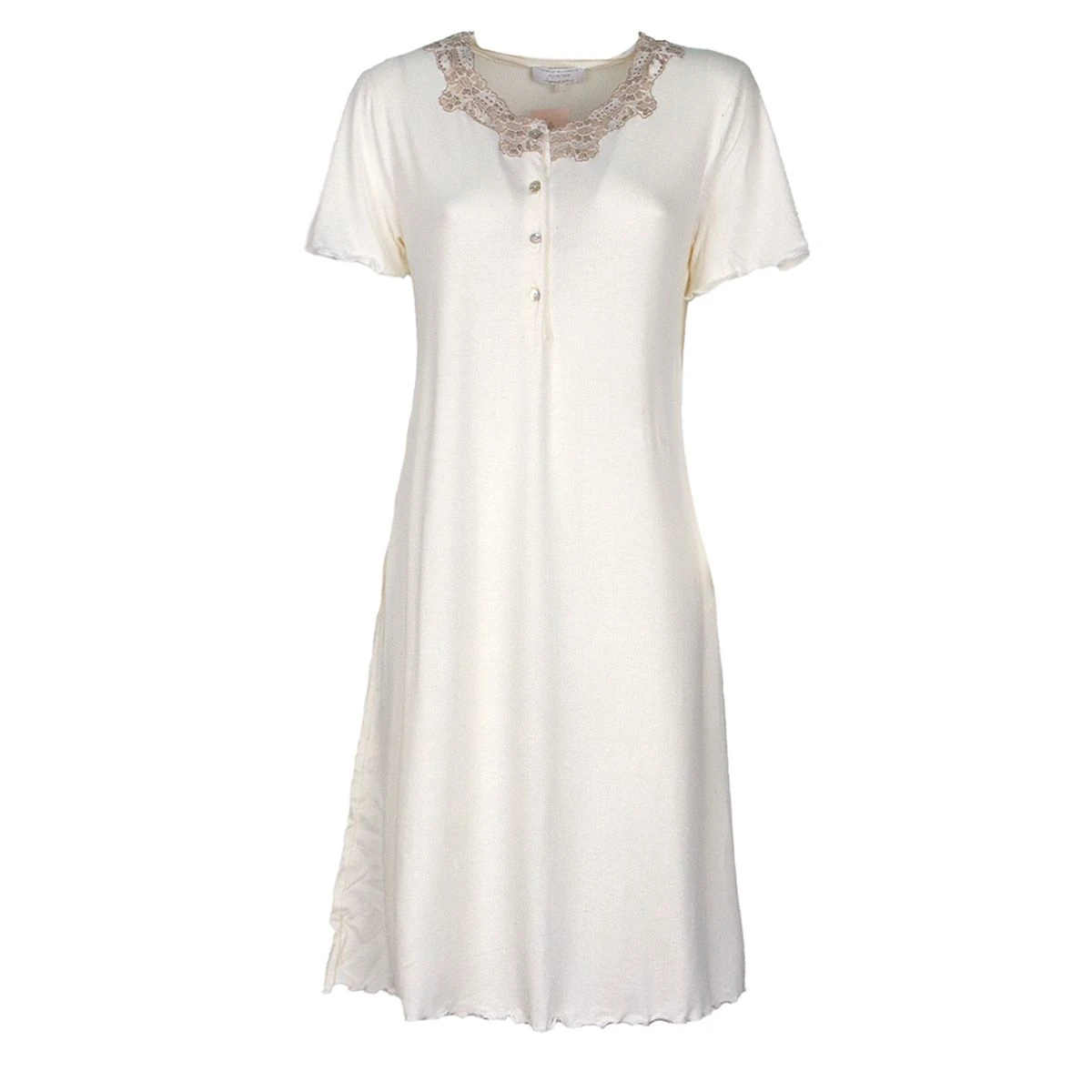 | Dettagli | La confezione contiene una camicia da notte in viscosa Girocollo serafino con bottoncini Applicazioni in merletto in contrasto di colore sul collo Manica raglan che permette un ampio movimento della spalla e del braccio Lunghezza media sotto al ginocchio Capo fresco e leggero adatto per la stagione estiva Ideale anche per l’allattamento Confezionata in una scatola stampata Made in Italy |