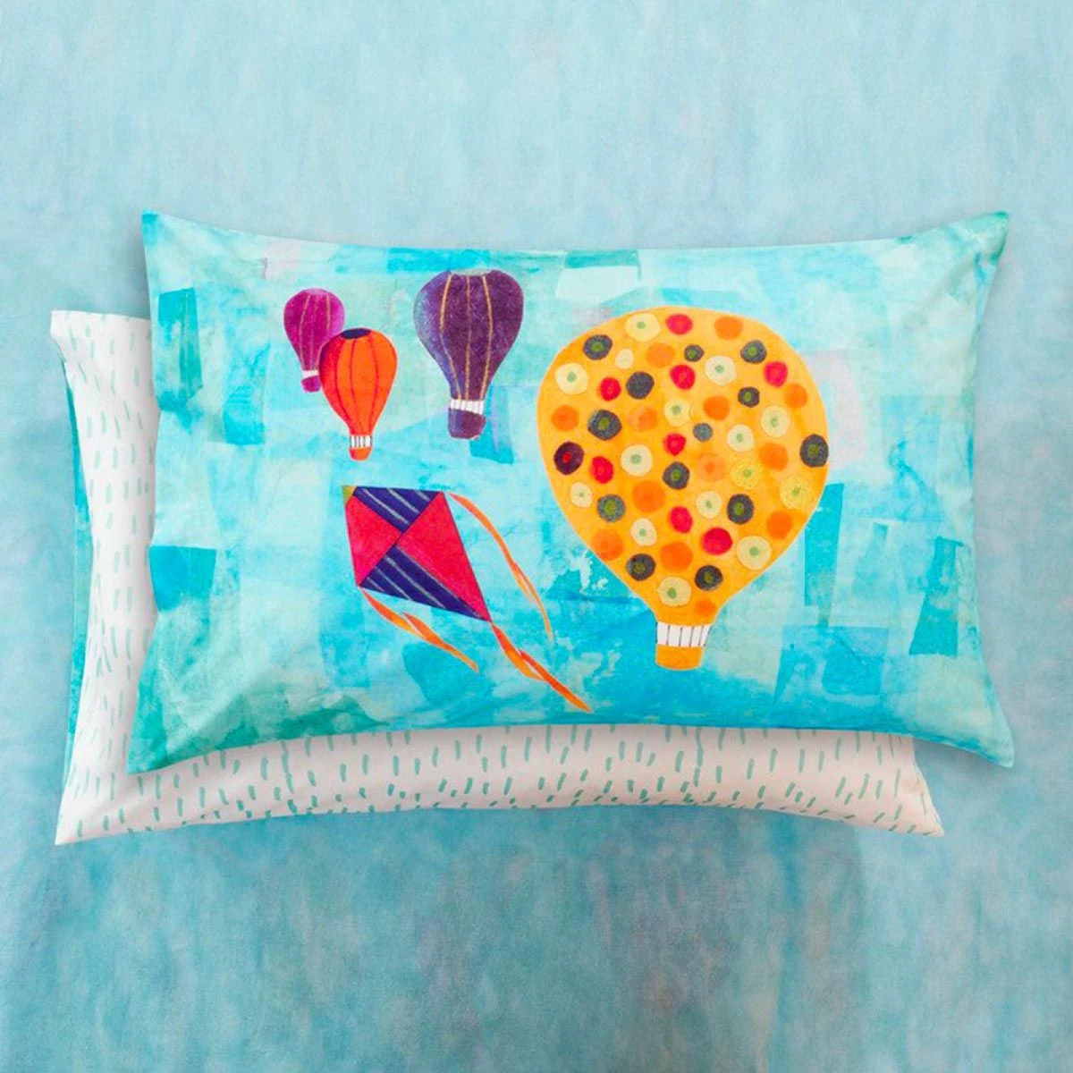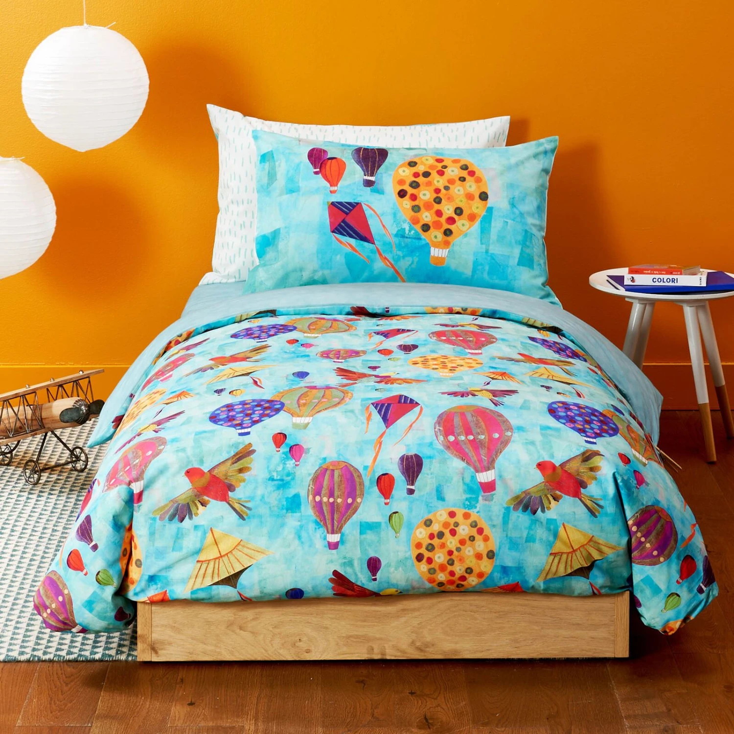 Un cielo fatto di aquiloni, mongolfiere e sogni che spiccano il volo. Il completo copripiumino Big Balloon è tutto questo. La stampa digitale in alta definizione accompagna la qualità della realizzazione in puro cotone.