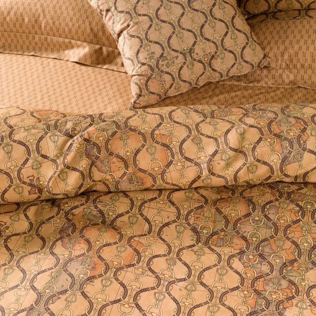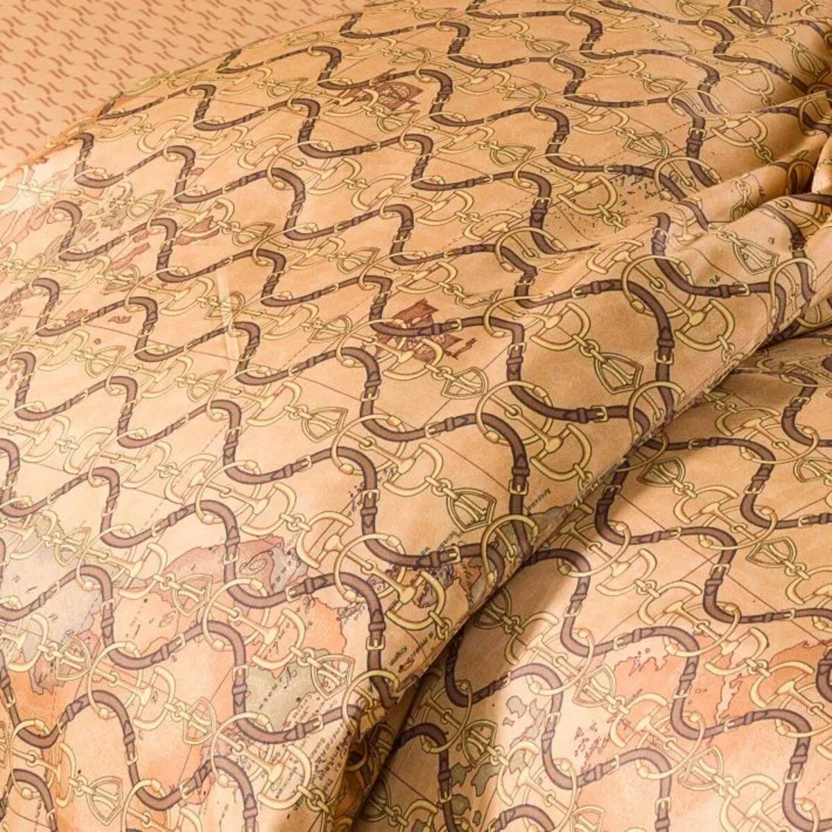 Il completo copripiumino Morsetto cuoio deve il suo nome all’originalità di Alviero Martini che firma il design di questo articolo lasciando incontrare due stili iconici di moda. Realizzato in raso di puro cotone, il completo copripiumino presenta colori vividi che danno un tocco ricercato all’arredo.