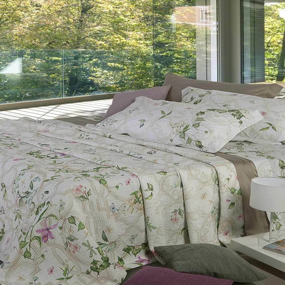 | Dettagli | La confezione contiene un completo lenzuola composto da: 1 lenzuolo sopra 1 lenzuolo sotto con angoli da 30 cm 2 federe a sacchetto a tre volani Il lenzuolo sopra ha la balza applicata pertanto può essere utilizzato anche come copriletto leggero Stampa digitale ad alta definizione con motivo floreale Colori reattivi che rimangono inalterati nel tempo OEKO-TEX certifica l’assenza di sostanze nocive per l’uomo e l’ambiente Custodito in una confezione in pvc con zip di chiusura Made in Italy |
