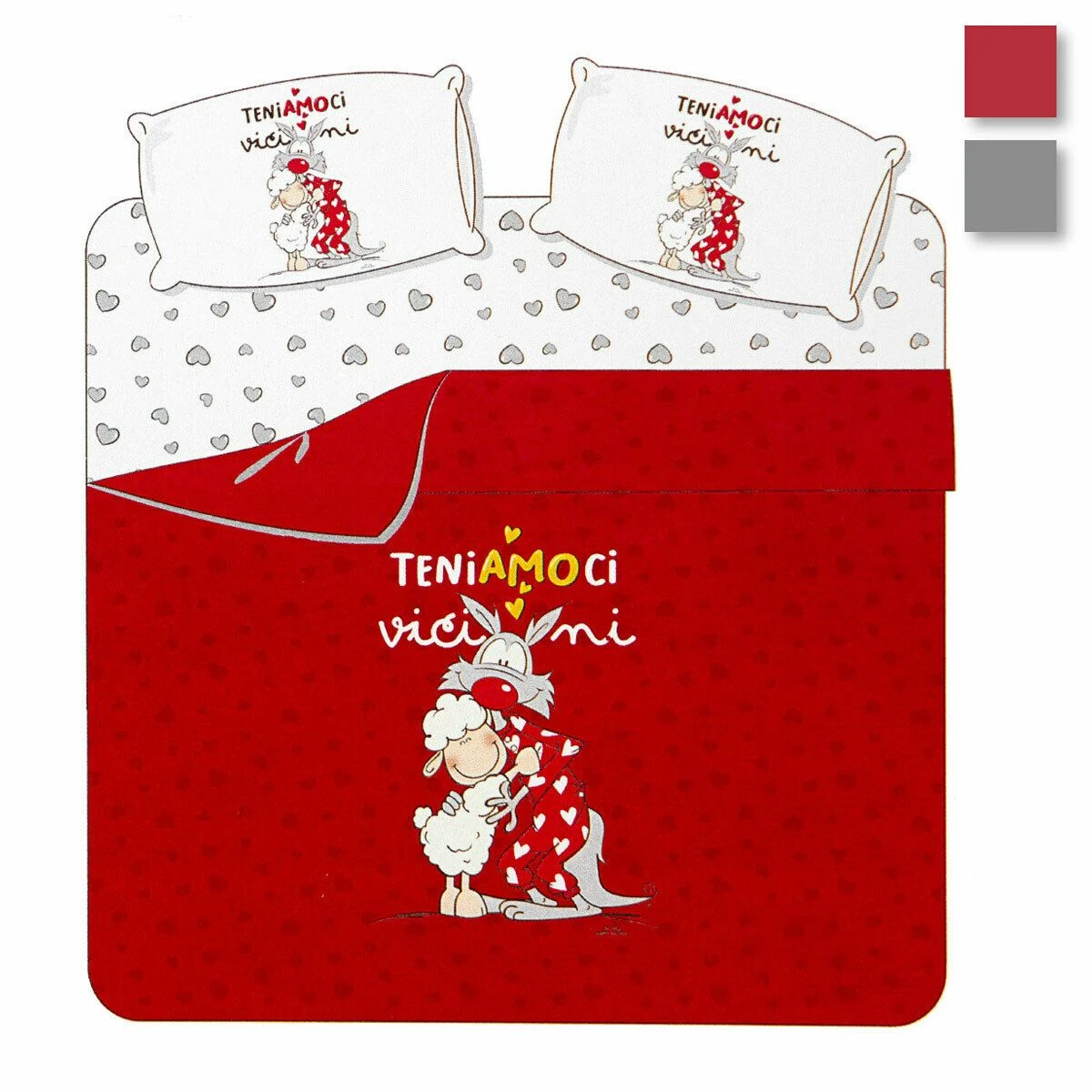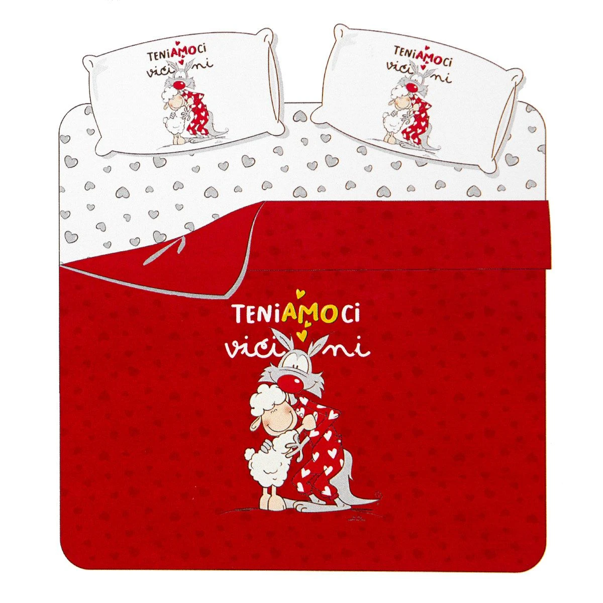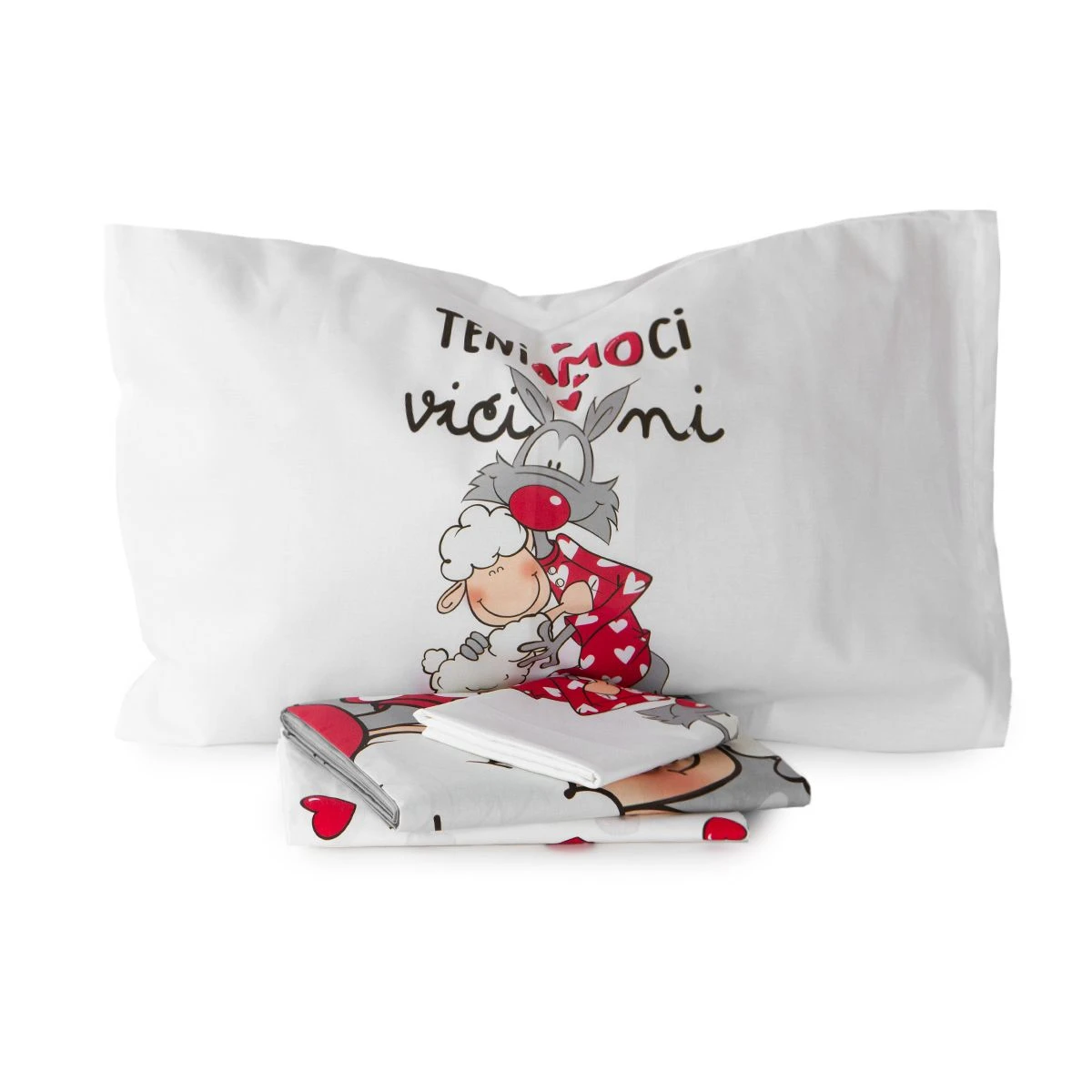 | Dettagli | La confezione contiene un completo lenzuola composto da: Un lenzuolo sopra Un lenzuolo sotto con angoli Le dimensioni per letto singolo e da una piazza e mezza contengono 1 federa, quella per letto matrimoniale 2 federe Il lenzuolo sopra ha la balza applicata pertanto può essere utilizzato anche come copriletto leggero Stampa con il lupo e la pecorella tipici del marchio e scritta “teniamoci vicini” Lenzuolo sotto stampato con motivo a cuori Percalle di puro cotone da 70 fili/cmq Made in Italy |