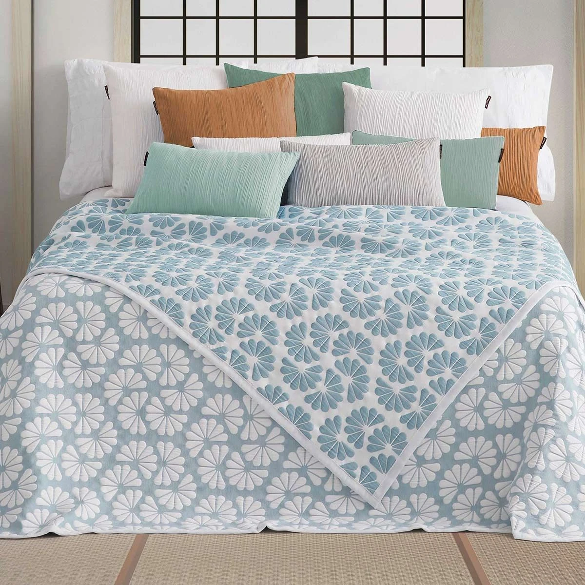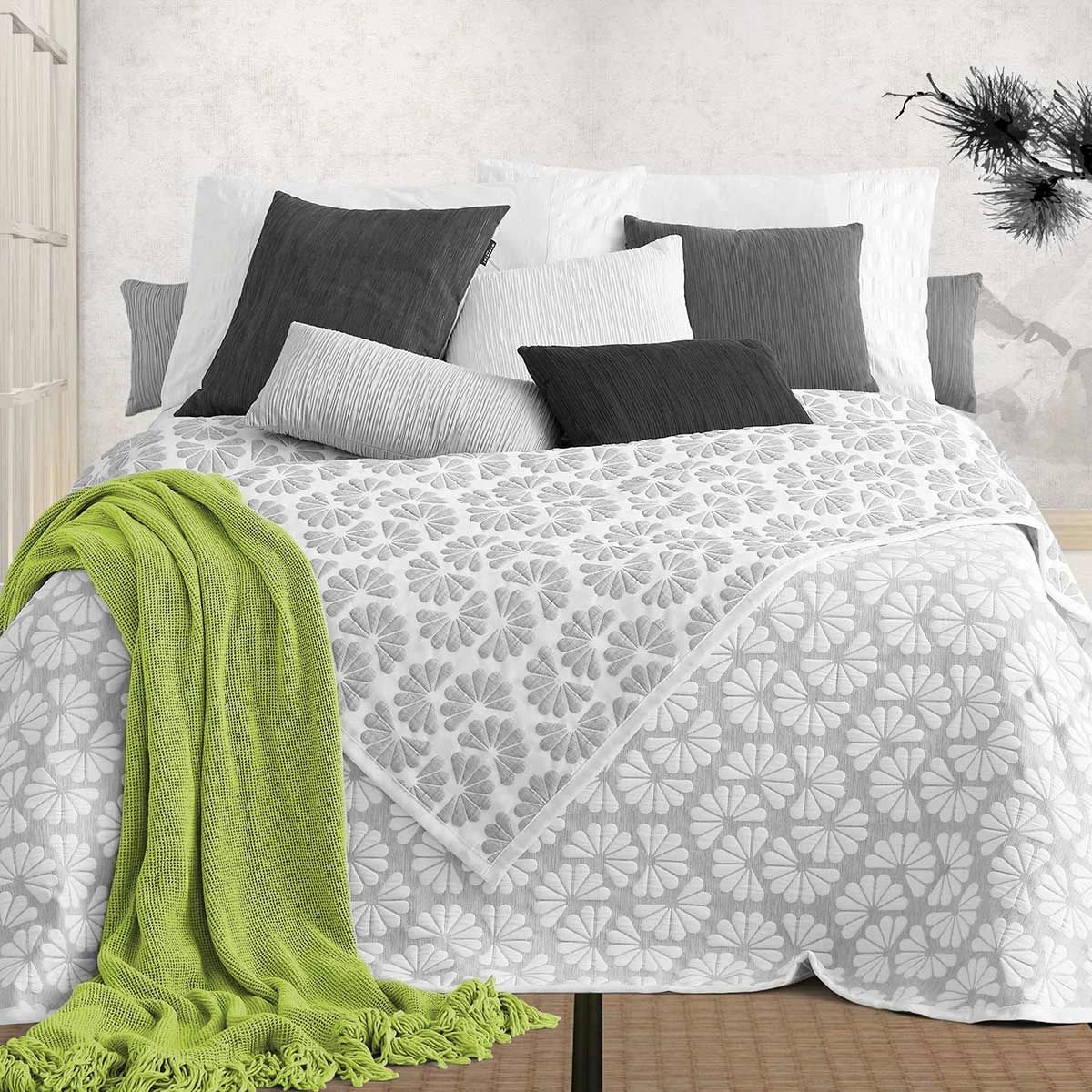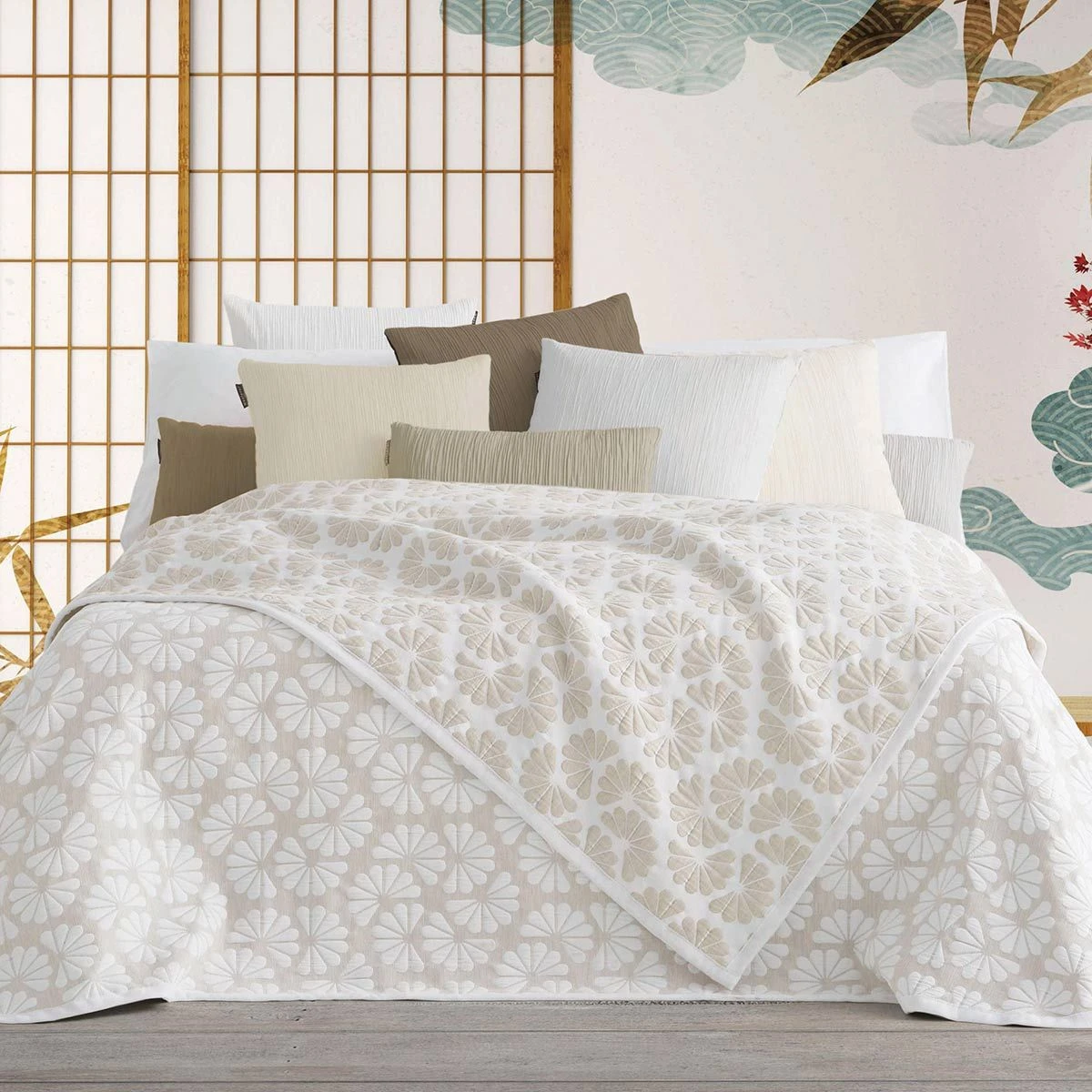 Un motivo a ventagli jaquard decora con semplicità il copriletto Japon di Manterol. Elegante e leggermente imbottito, è adatto per la primavera e l’autunno.