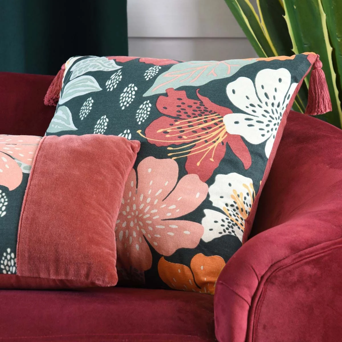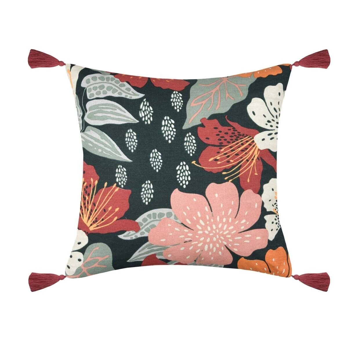 | Dettagli | La confezione contiene un cuscino arredo Forma quadrata Motivo floreale Retro in tinta unita Dotato di nappe poste all’estremità degli angoli Sfoderabile tramite cerniera |