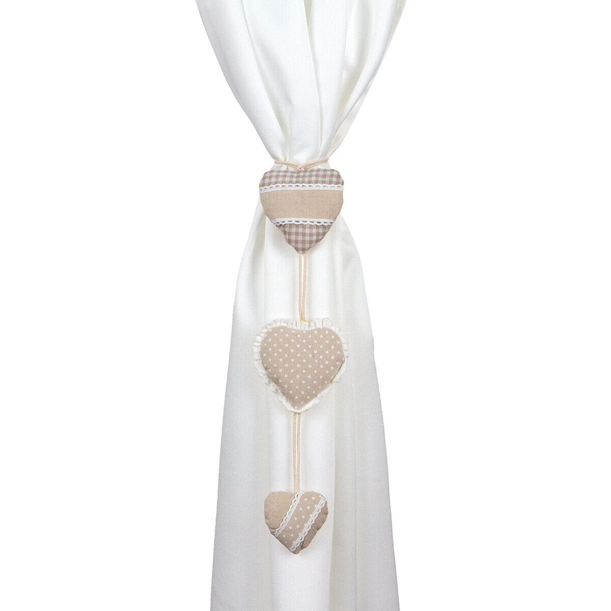 | Dettagli | La confezione contiene un fermatenda composto da: 1 nastro/laccio in corda intrecciata 3 decori imbottiti a forma di cuore Tessuto a quadretti, a pois ed in tinta unita Applicazione in passamaneria Chiusura con asola |
