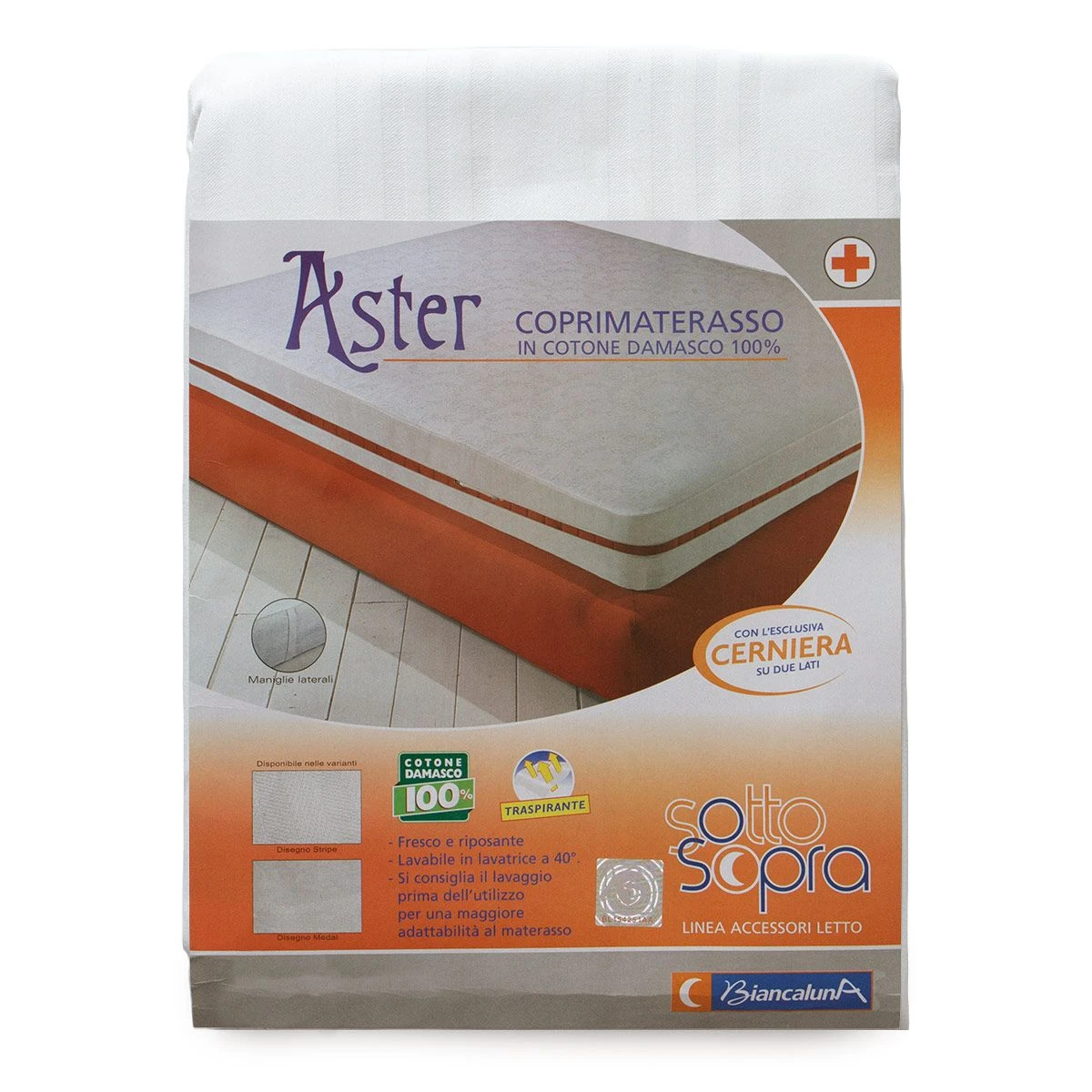 La fodera coprimaterasso rigata Aster di Biancaluna è un’ottima soluzione per proteggere dalla polvere il lato inferiore del tuo materasso. La cerniera ad L sui due lati e le maniglie laterali rendono esclusivo questo prodotto.