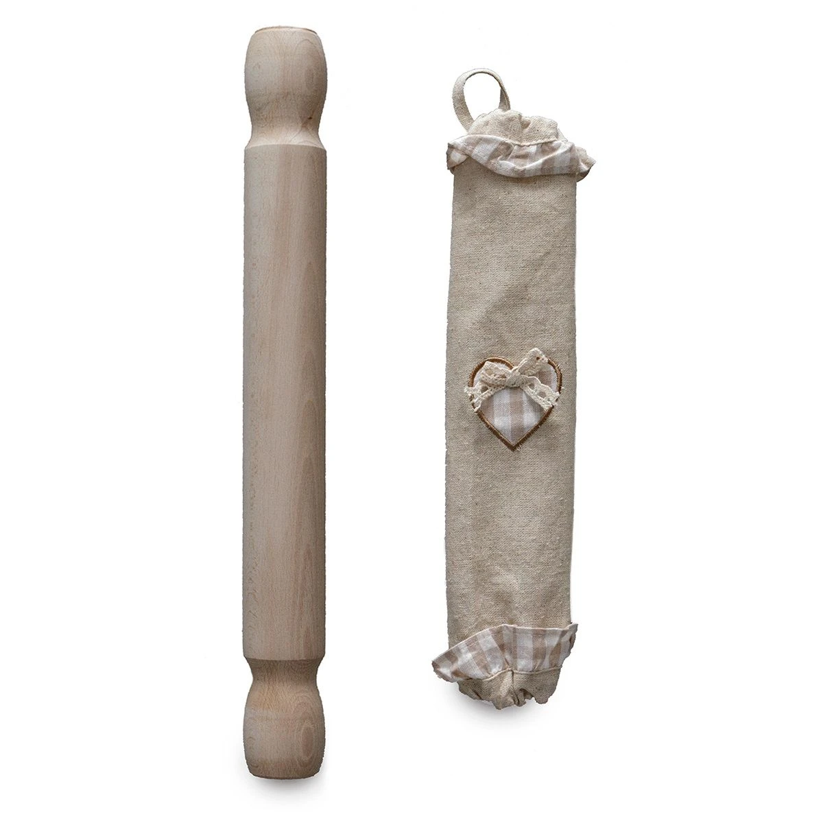 | Dettagli | La confezione contiene un mattarello da cucina con fodera Fodera decorativa in tessuto effetto lino con ricamo cuore centrale ed estremità con elastico Fodera dotata di appendino in tessuto Idea regalo |