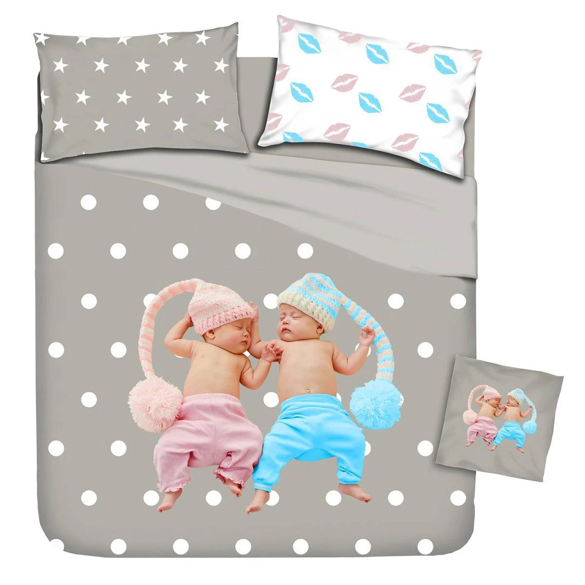 Due tenerissimi gemellini, un maschietto e una femminuccia, sono i protagonisti di questa parure copripiumino di Maestri Cotonieri. Il capo è realizzato in 100% cotone e riporta una stampa Super Digitale in 3D che rende realistica e nitida l’immagine riportata. La confezione contiene anche una federa cuscino in omaggio per completare l’arredo. Made in Italy.