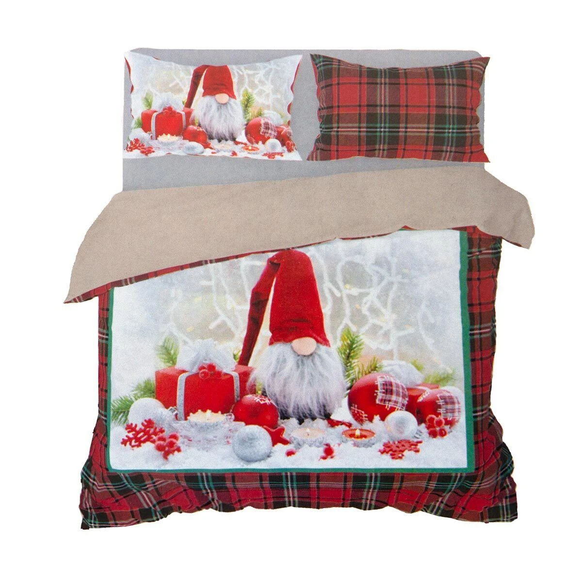| Dettagli | La confezione contiene una parure copripiumino per letto matrimoniale composta da: 1 sacco copripiumino 2 federe a sacchetto Motivo tartan Stampa digitale con gnomo a tema natalizio Elegante e raffinata |