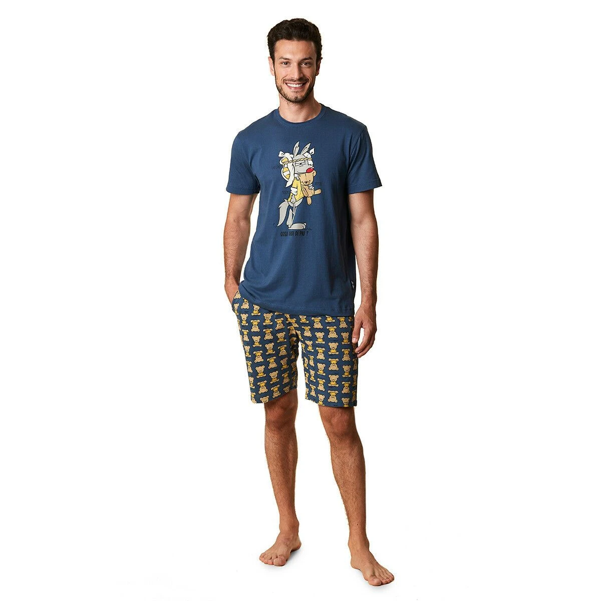 | Dettagli | La confezione contiene un pigiama per uomo estivo composto da: Una maglietta a mezza manica, girocollo e stampa centrale Un pantaloncino corto con motivo con orsetti, con elastico in vita Un sacchetto porta pigiama con laccio di chiusura Puro cotone fresco e leggero |