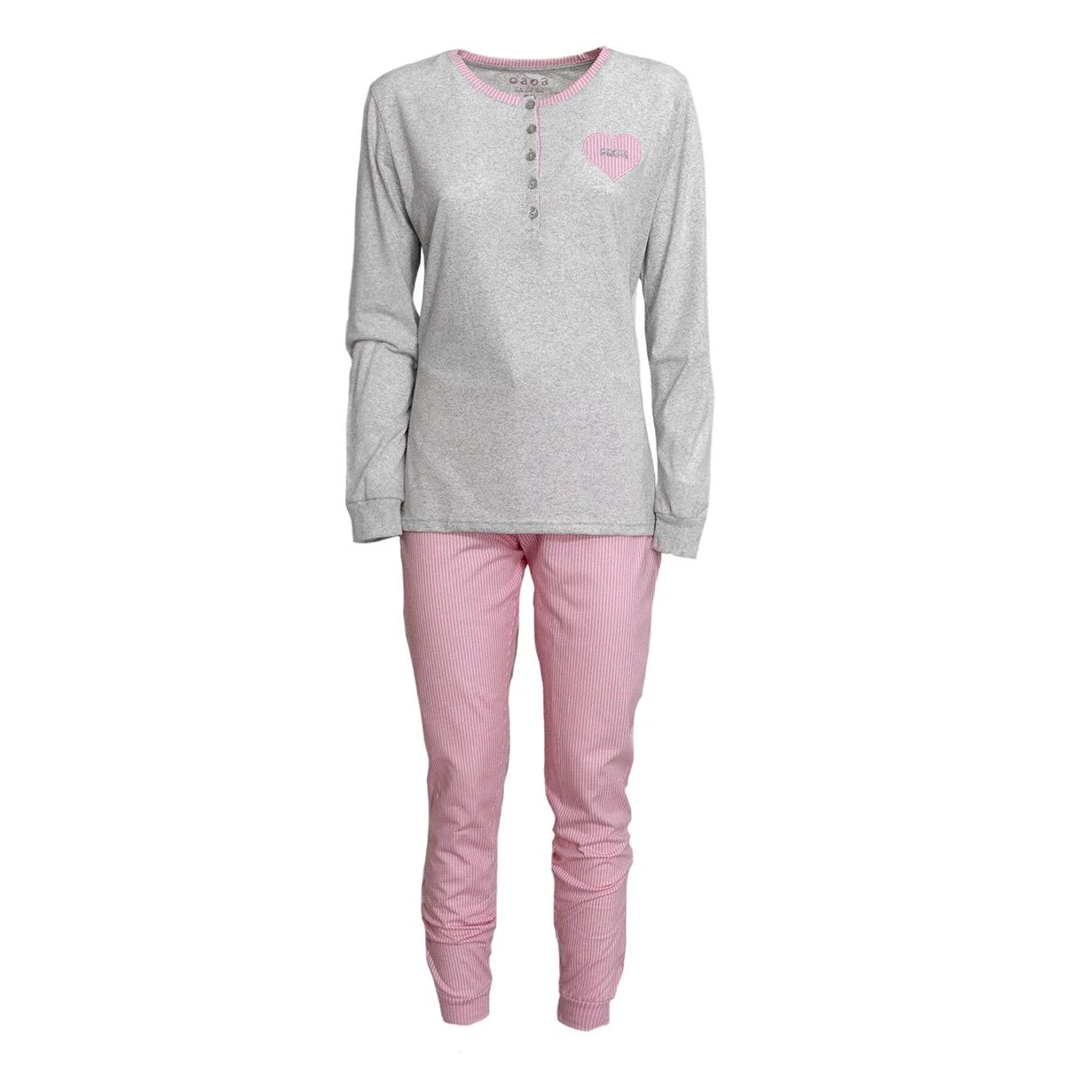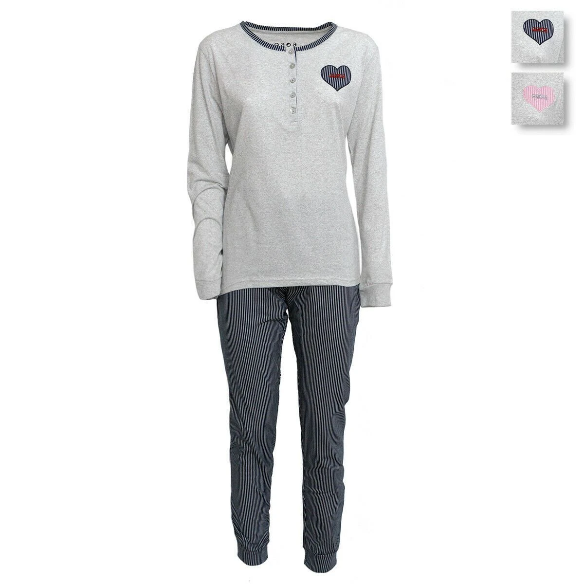 | Dettagli | La confezione contiene un pigiama da donna composto da: 1 maglia a manica lunga con scollo serafino e bottoncini glitterati, logo ricamato lateralmente 1 pantalone lungo a righe con elastico in vita e fiocchetto, polsini elasticizzati Dettagli in contrasto di colore Jersey di cotone, fresco e leggero, adatto per tutto l’anno Confezionato in una scatola stampata |