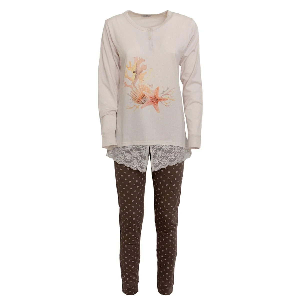 | Dettagli | La confezione contiene un pigiama per donna composto da: 1 maglia con scollo serafino, stampa centrale con fiocchetto applicato, balza inferiore in pizzo 1 pantalone lungo stampato con stelle e conchiglie, elastico in vita e polsini elasticizzati Casual e sbarazzino ideale anche per la casa Cotone, fresco e leggero, adatto per tutto l’anno Confezionato in una scatola stampata |