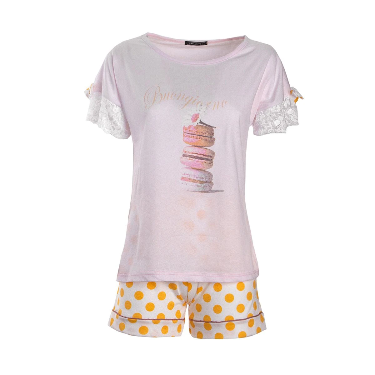 | Dettagli | La confezione contiene un pigiama da donna estivo composto da: 1 maglia girocollo a mezza manica con applicazioni in pizzo 1 pantalone corto stampato con elastico in vita Jersey di puro cotone, fresco e leggero Confezionato in una scatola stampata |