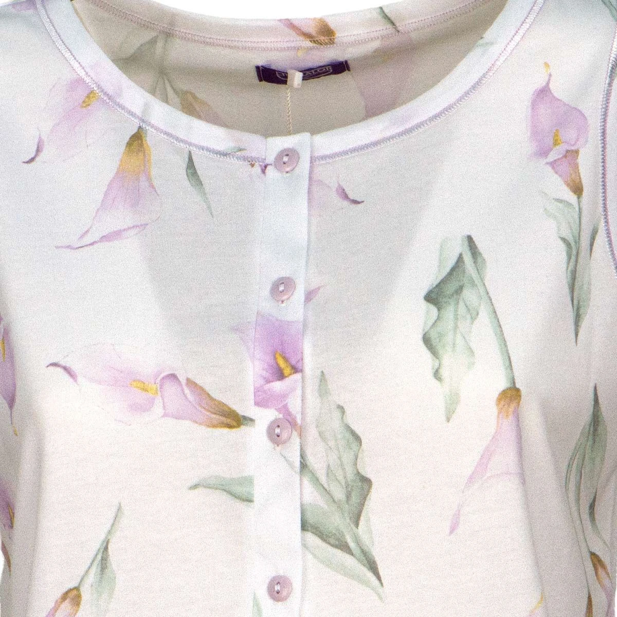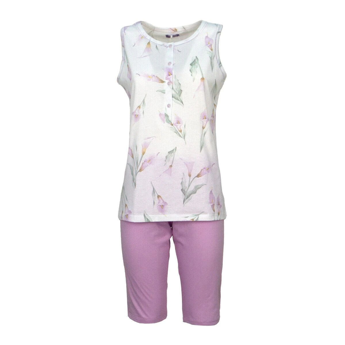 | Dettagli | La confezione contiene un pigiama da donna estivo composto da: 1 canotta stampata con scollo serafino e spalla larga 1 pantalone bermuda tinta unita con elastico in vita Motivo stampato con fiori Jersey di puro cotone, fresco e leggero Confezionato in una scatola stampata |
