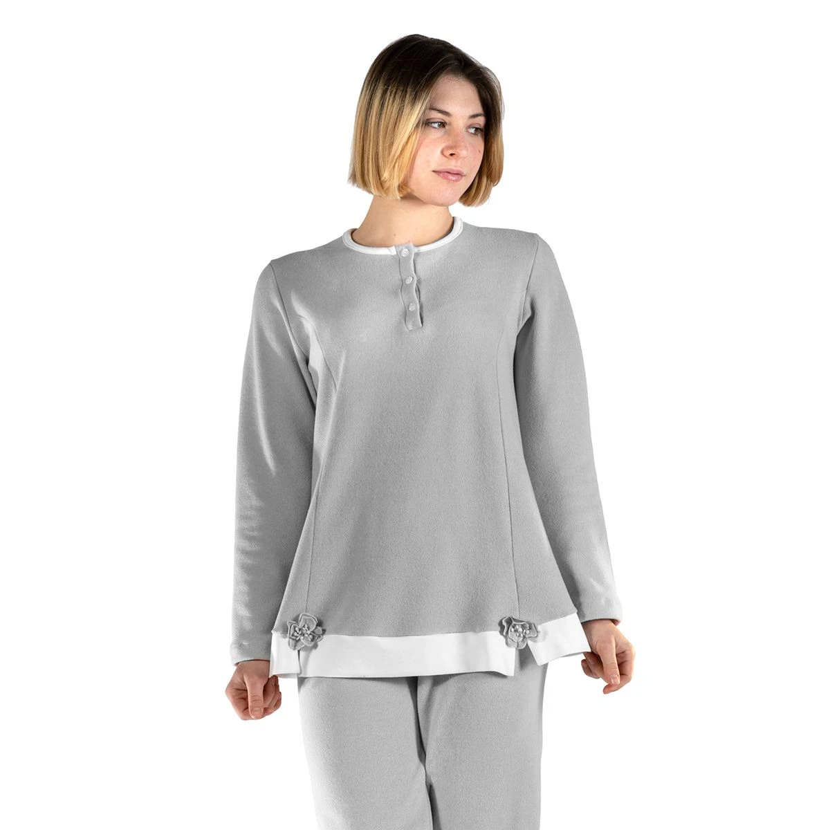 | Dettagli | La confezione contiene un pigiama da donna composto da: 1 maglia manica lunga scollo serafino in contrasto di colore e bottoncini 1 pantalone tinta unita con elastico in vita La maglia presenta due fiocchetti applicati sull’estremità Morbido e soffice punto milano Il prodotto è confezionato in scatola Made in Italy |