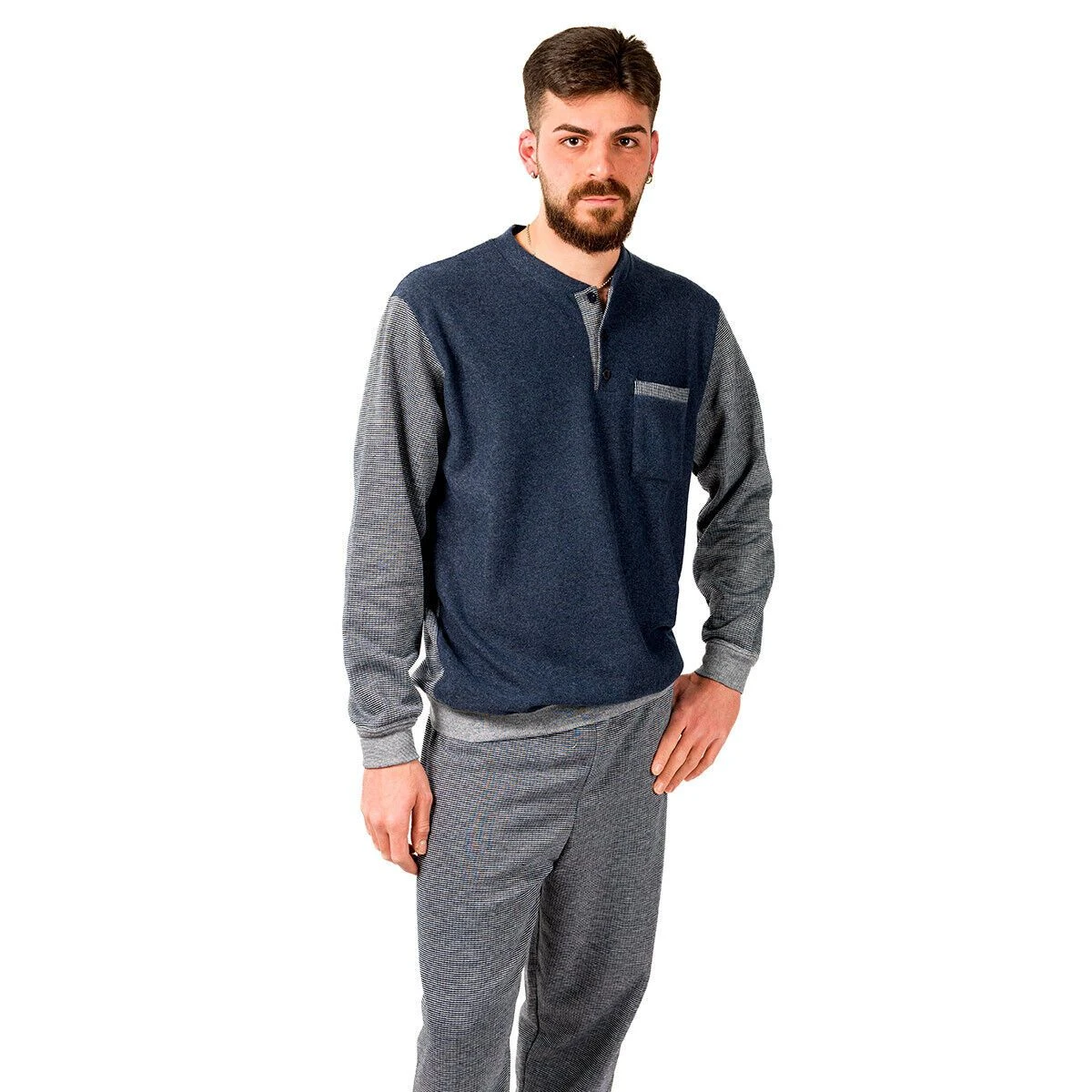 Alessandro, da sempre un nome forte e tenace, ispira questo pigiama Morbidissimi in punto milano, pensato per riscaldarti durante l’inverno donandoti un look da vero king.