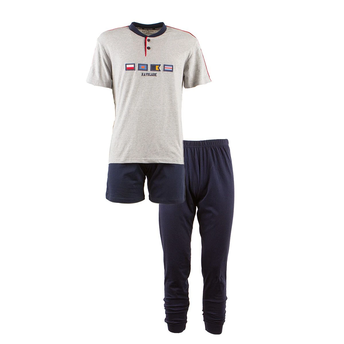 | Dettagli | La confezione contiene un pigiama da uomo composto da 3 pezzi di cui: Una maglia a mezza manica girocollo serafino con stampa centrale Un pantalone corto tinta unita Un pantalone lungo tinta unita con polsini elasticizzati Jersey di cotone Ideale per il periodo estivo Cotone, fresco e leggero, adatto per tutto l’anno Confezionato in una scatola stampata |