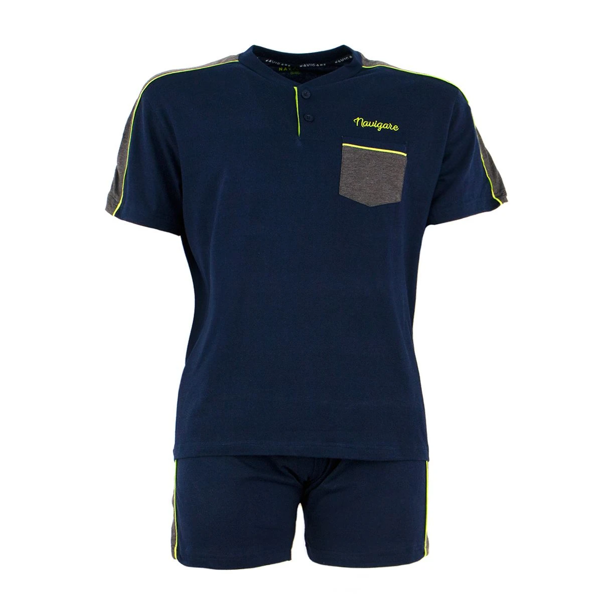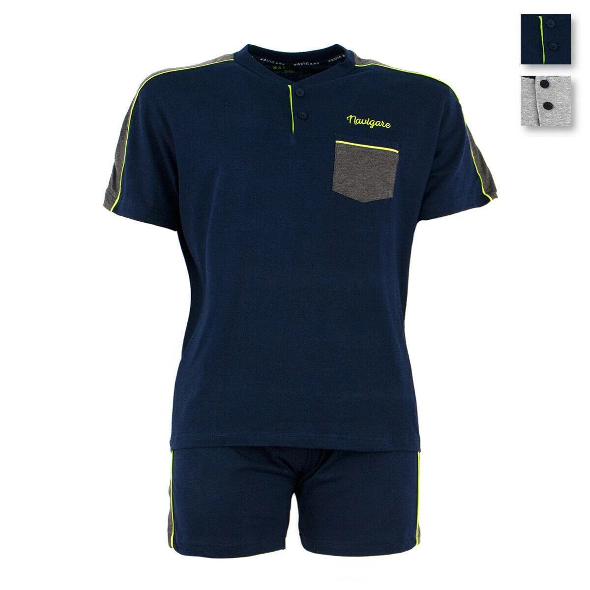 | Dettagli | La confezione contiene un pigiama per uomo composto da: Una maglia a mezza manica scollo serafino con bottoncini Taschino sul petto in contrasto di colore con logo ricamato Un pantalone corto tinta unita con striscia laterale in contrasto di colore, con elastico in vita e taschino posteriore Jersey di cotone Capo estivo leggero e comodo Confezionato in una scatola stampata |