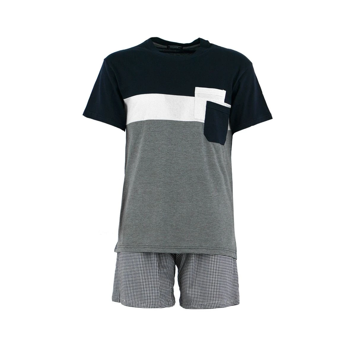 | Dettagli | La confezione contiene un pigiama da uomo composto da: Una maglia a mezza manica girocollo, con doppio taschino sul petto Un pantalone corto a quadretti Motivo a righe Jersey di cotone Capo estivo leggero e comodo Confezionato in una scatola stampata |