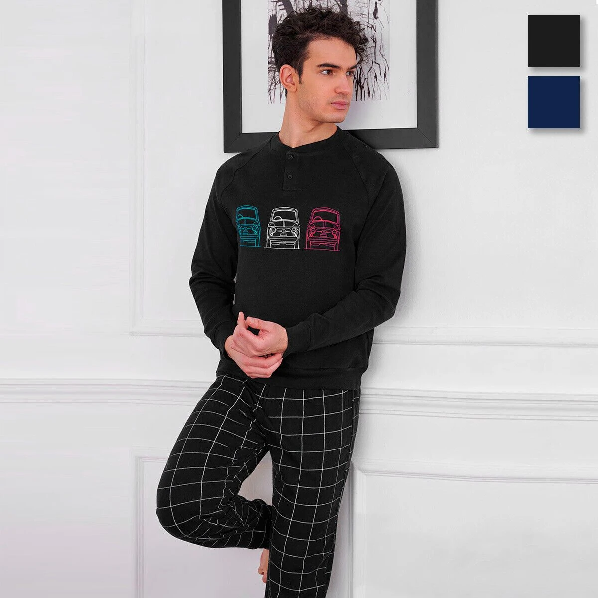 | Dettagli | La confezione contiene un pigiama da uomo composto da: 1 maglia manica lunga girocollo serafino con stampa centrale 1 pantalone lungo con motivo a quadri con laccio regolabile in vita Maglia e pantalone hanno i polsini elasticizzati Caldo cotone ideale per il periodo invernale Confezionato in una scatola stampata |