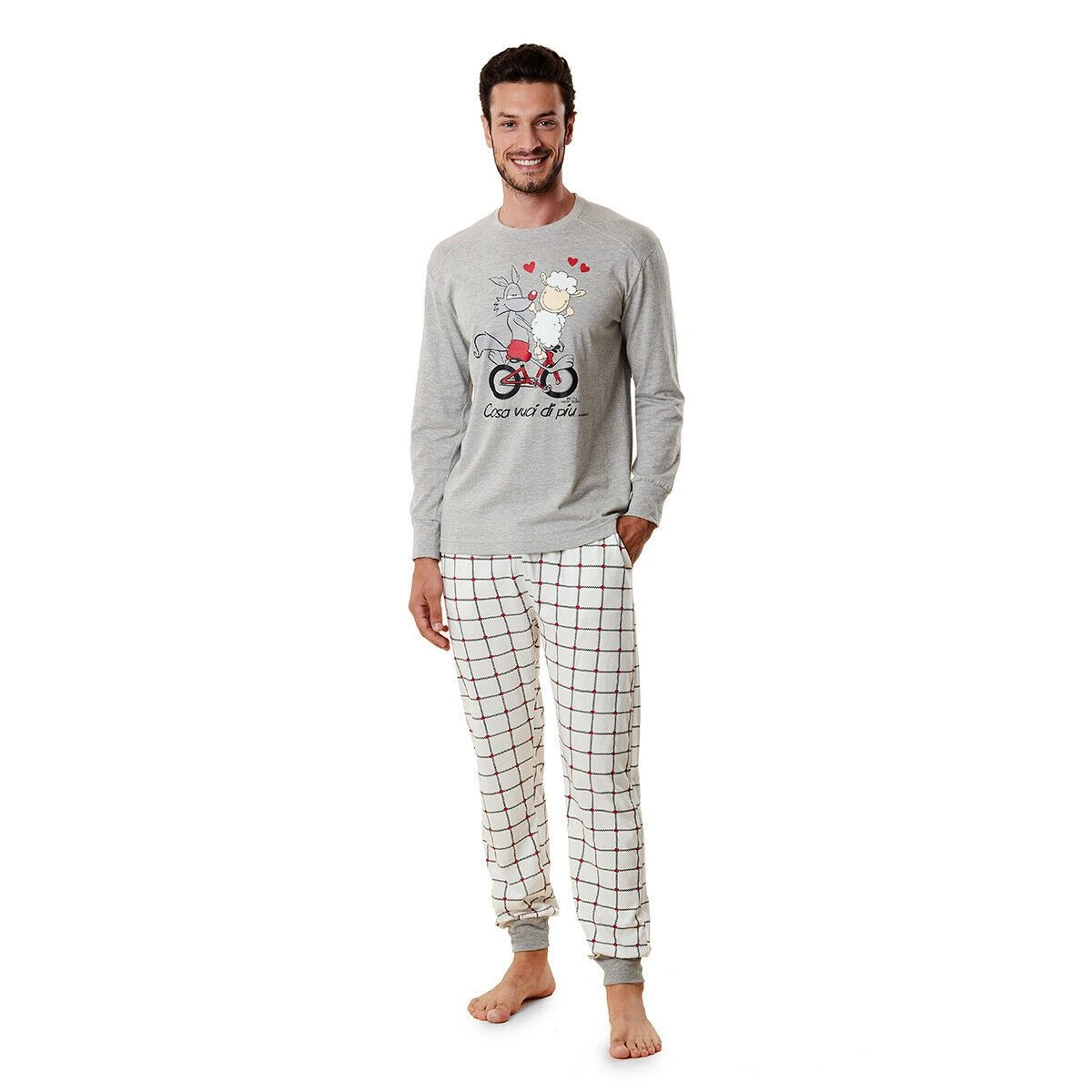 | Dettagli | La confezione contiene un pigiama per uomo composto da: Una maglia a manica lunga con girocollo e stampa centrale Un pantalone con motivo a quadri e piccoli cuori Un sacchetto porta pigiama Originale e casual Adatto anche per stare in casa Morbido e soffice cotone Ideale per tutto l’anno |