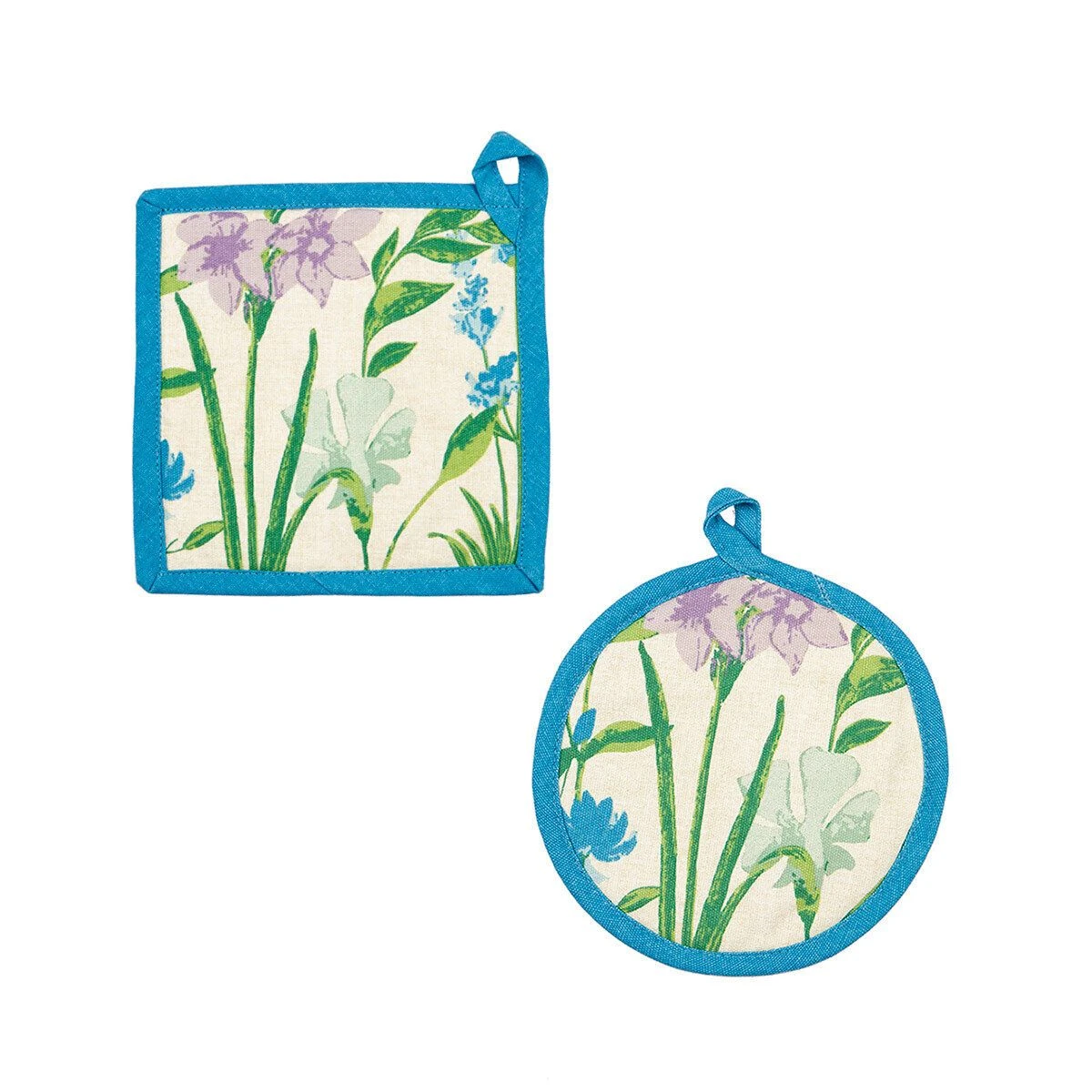 Con il set di presine Dalila la primavera prende vita nella tua cucina. La stampa HD raffigura fiori dalle sfumature azzurre, conferendo un tocco di stile e freschezza a questi pratici accessori.