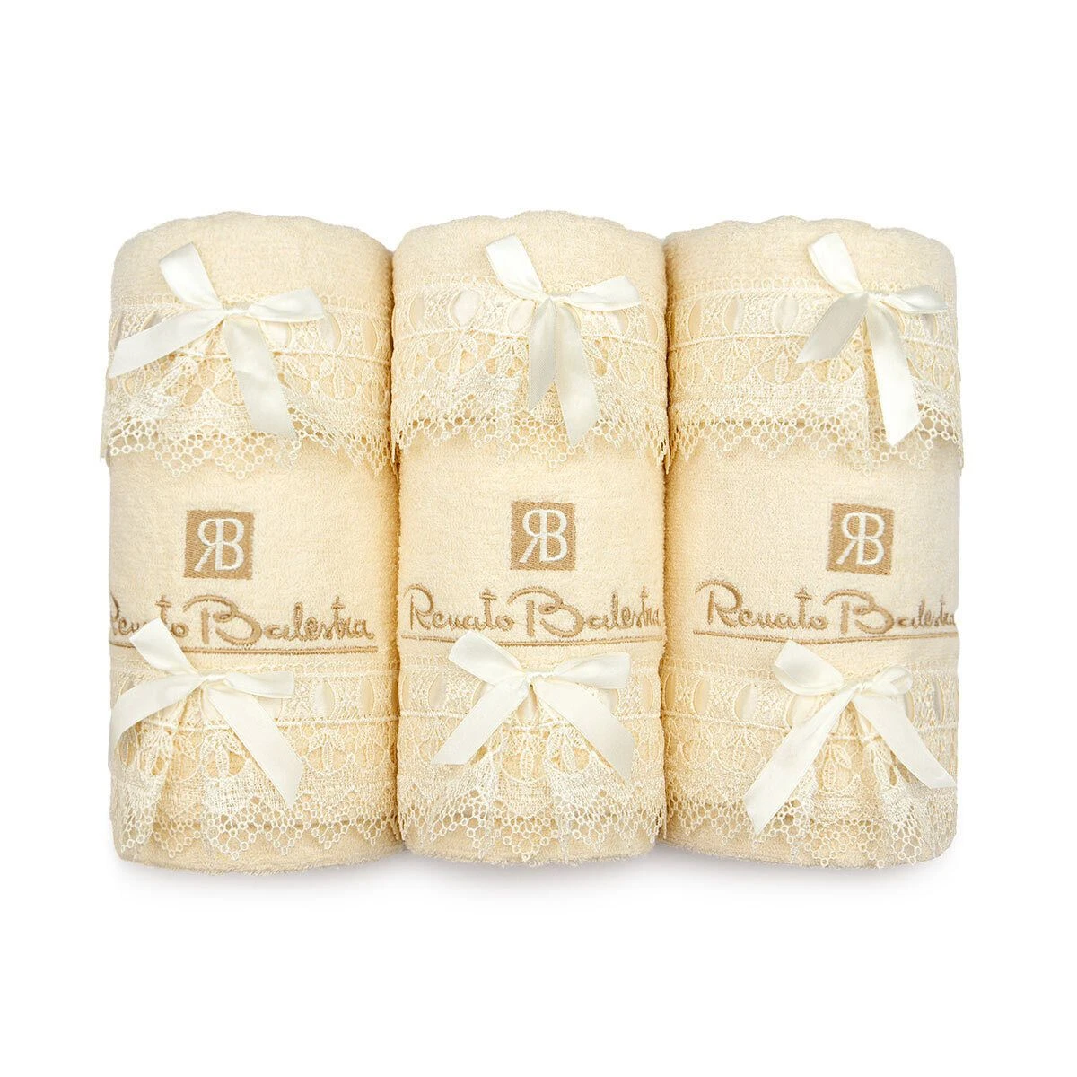 | Dettagli | La confezione contiene un set di asciugamani da 6 pezzi composto da: 3 asciugamani viso e 3 asciugamani ospite Applicazioni con pizzo rebrodè operato e fiocchetti con nastrino in raso Logo Renato Balestra ricamato Tessuto di prima qualità Confezionamento artigianale Gli asciugamani sono custoditi all’interno di una scatola in cartone rigido Certificato interno di garanzia e qualità Idea regalo |