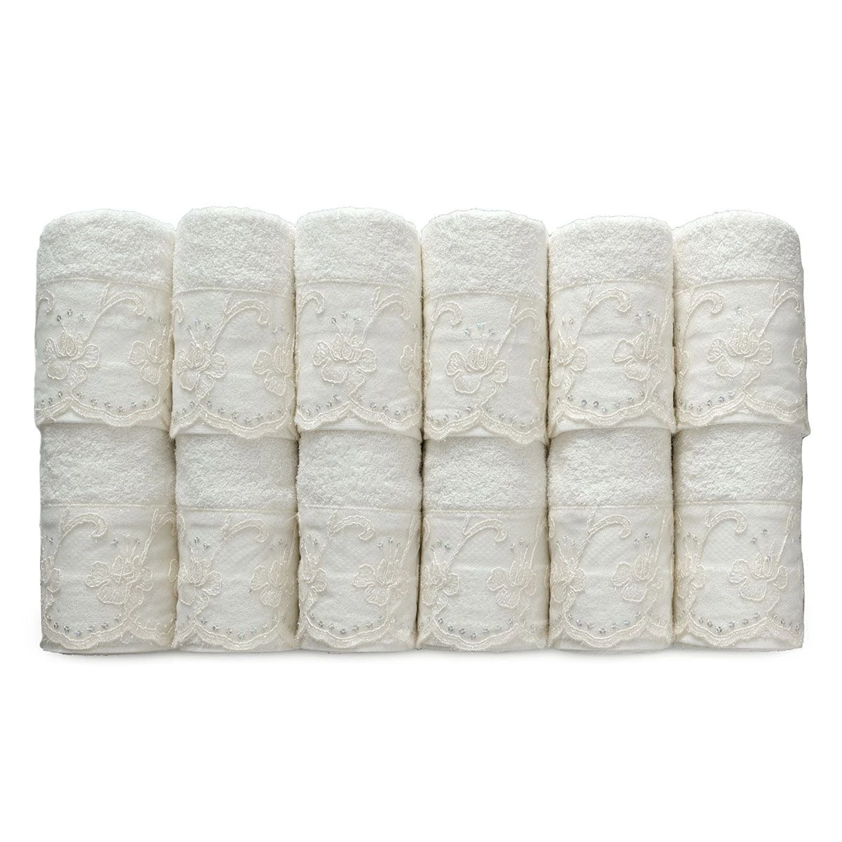 | Dettagli | La confezione contiene un set di asciugamani da 12 pezzi composto da: 6 asciugamani viso e 6 asciugamani ospite Applicazioni con pizzo rebrodè operato e paillettes Tessuto di prima qualità Confezionamento artigianale Gli asciugamani sono custoditi all’interno di una scatola in cartone rigido Certificato interno di garanzia e qualità Ottima anche come idea regalo |