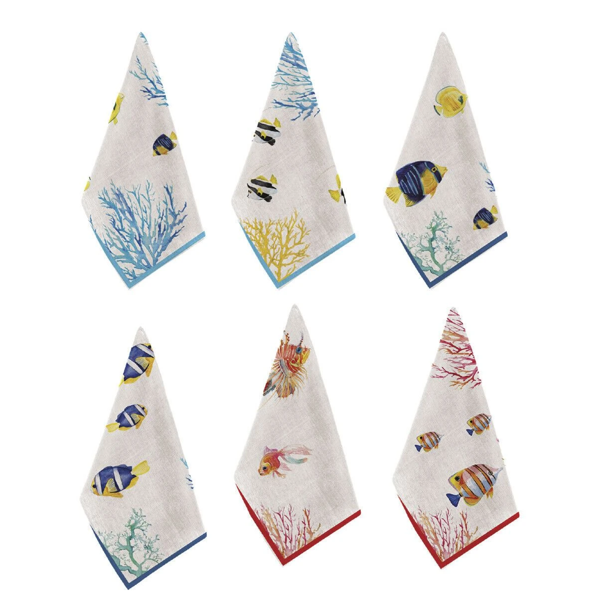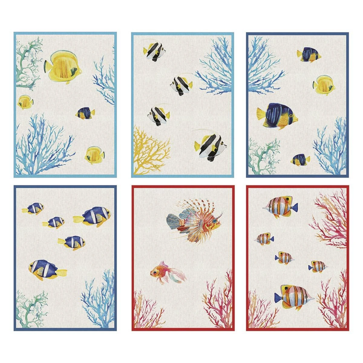 | Dettagli | La confezione contiene un set composto da 6 canovacci Forma rettangolare Stampa HD in alta definizione con pesci Fantasia differente per ciascun canovaccio Retro in tinta unita Appendino nascosto, posto nell’angolo posteriore Utilizzabili come canovacci e asciugapiatti Puro cotone, resistente ai numerosi lavaggi Disegnato e progettato in Italia |