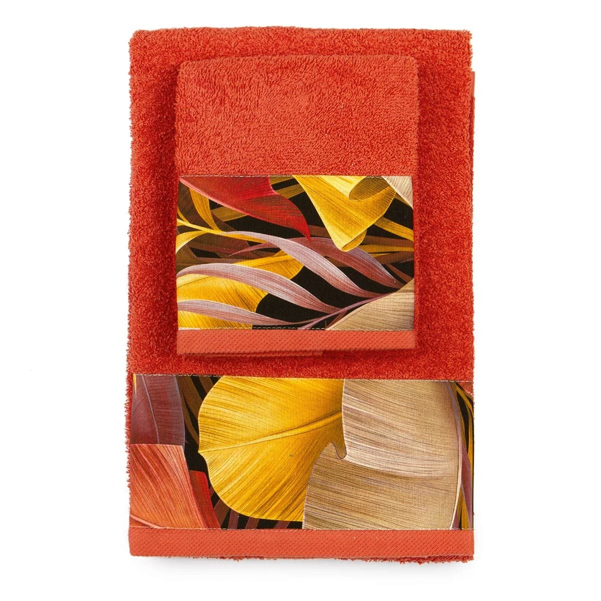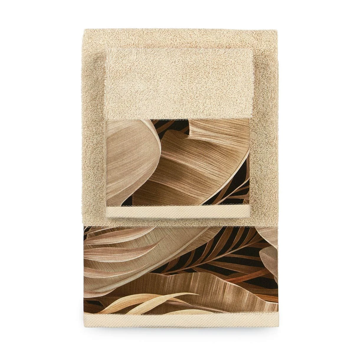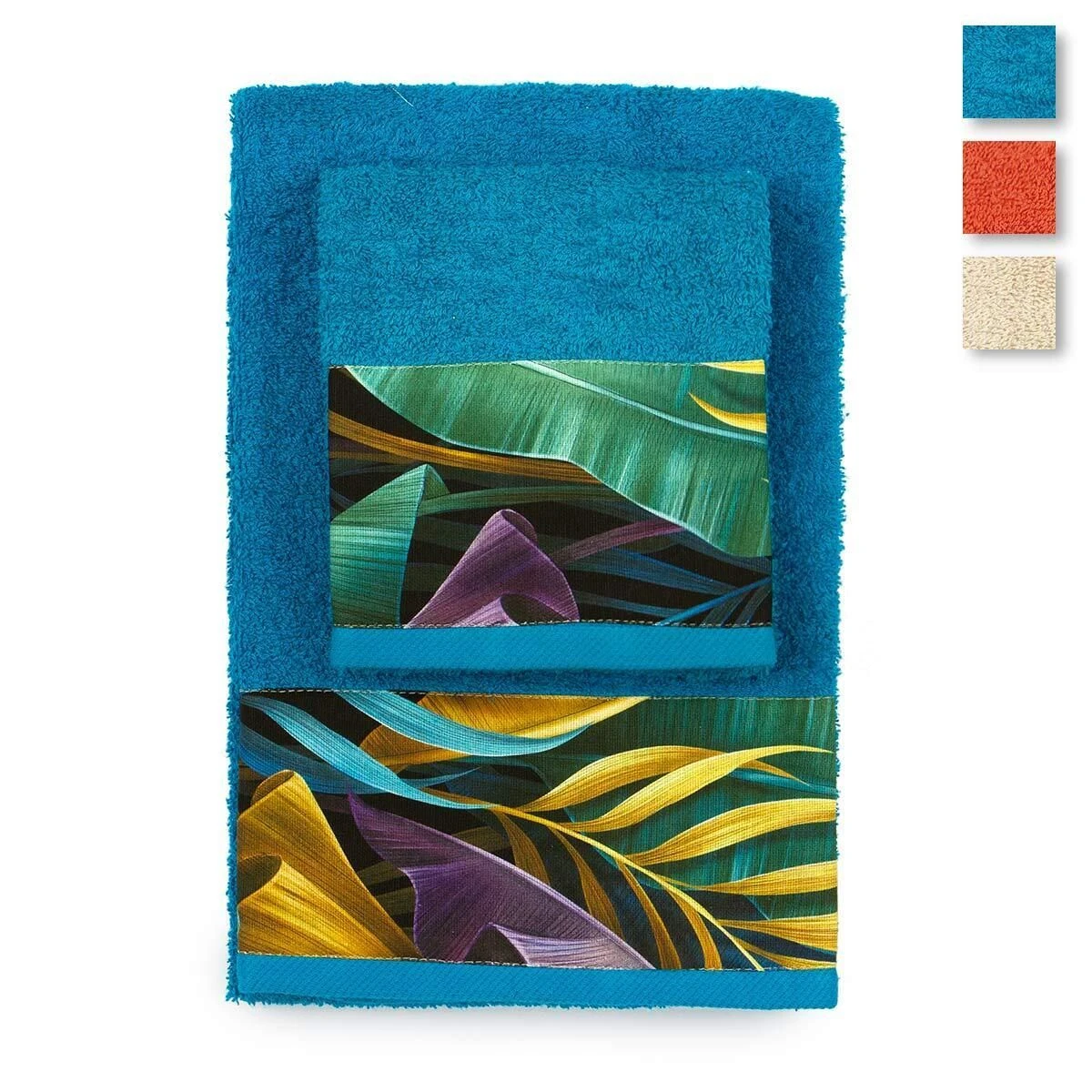 | Dettagli | La confezione contiene un set di asciugamani composto da: 1 asciugamano viso 1 asciugamano ospite Morbida spugna a riccio di puro cotone, idrofila ed assorbente Bordo in cotone con motivo foliage Made in Italy |