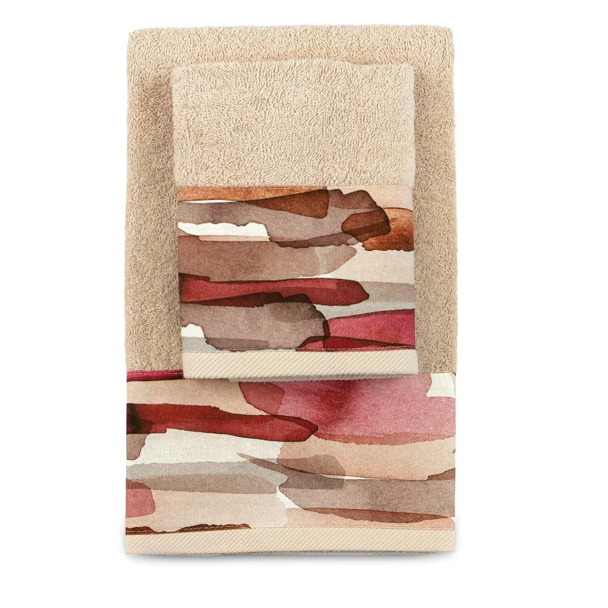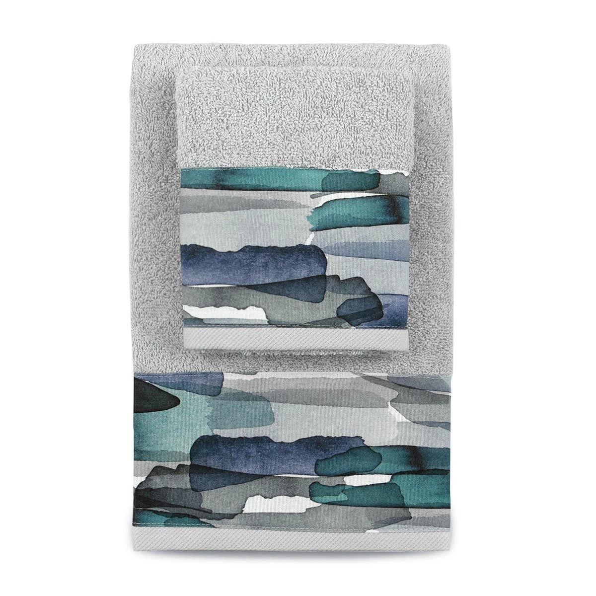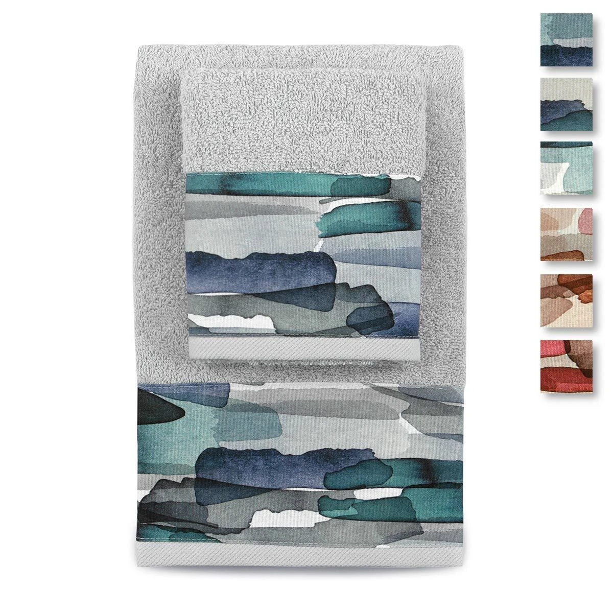 Il set di asciugamani Gaia presenta un bordo con stampa digitale con varie tonalità di colori che racchiudono uno stile moderno ed elegante. Gli asciugamani contenuti all’interno del set sono realizzati in spugna di puro cotone, soffice ed assorbente.