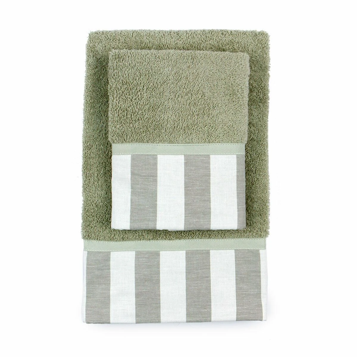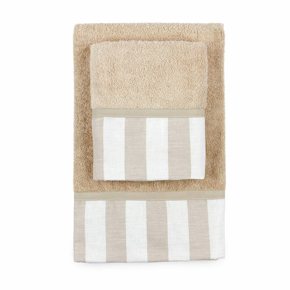 | Dettagli | La confezione contiene un set di asciugamani composto da: 1 asciugamano viso 1 asciugamano ospite Morbida spugna a riccio di puro cotone, idrofila ed assorbente Bordo in cotone, stampa digitale con motivo a righe Made in Italy |