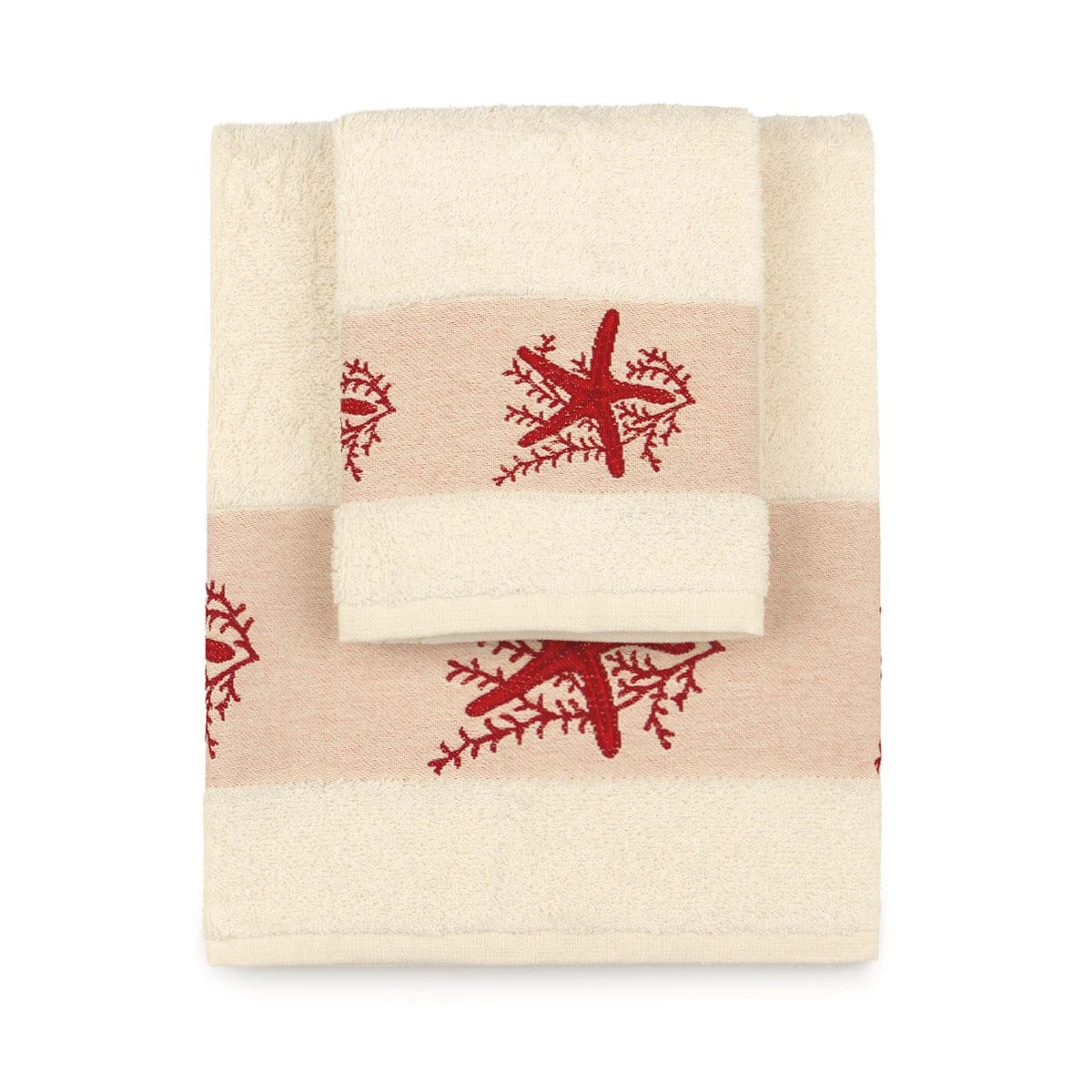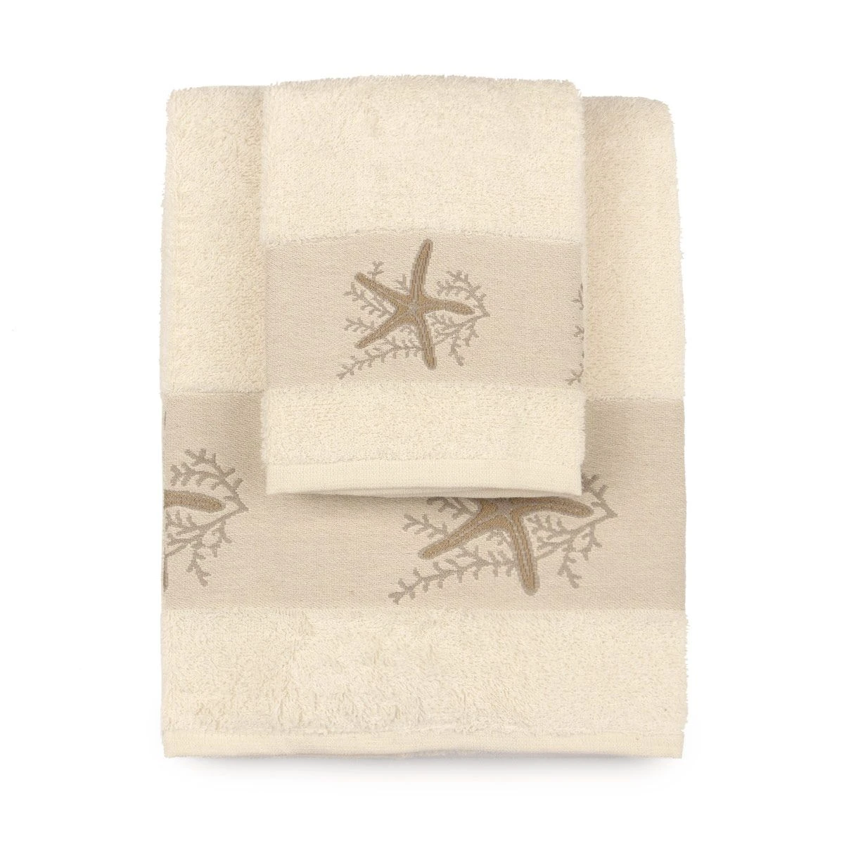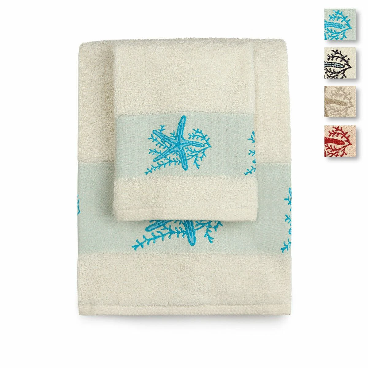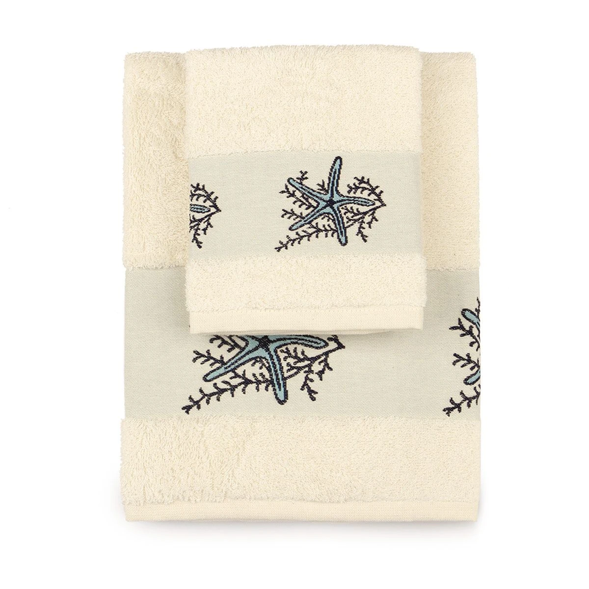 | Dettagli | La confezione contiene un set di asciugamani composto da: 1 asciugamano viso 1 ospite Grammatura spugna 400 gr/mq Bordo ricamato con stelle marine Disegnato e progettato in Italia |