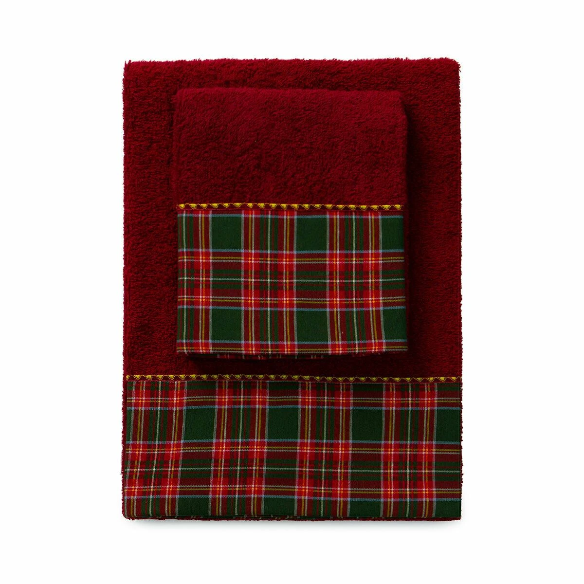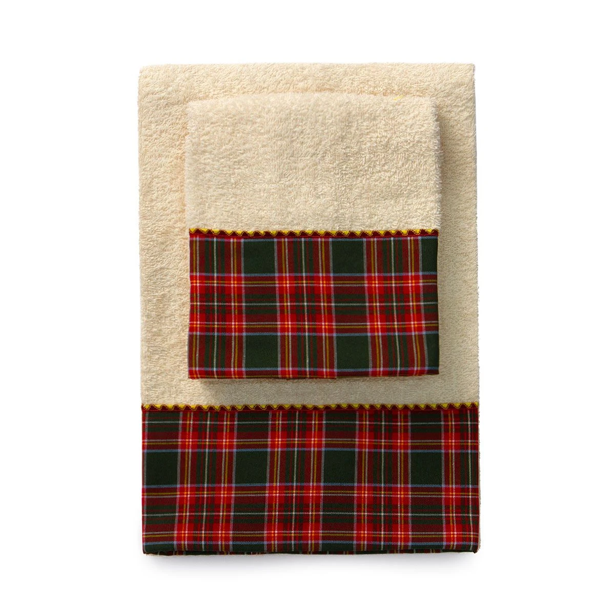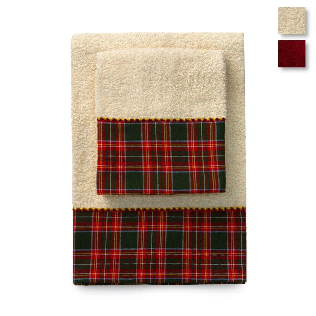 | Dettagli | La confezione contiene un set di asciugamani composto da: 1 asciugamano viso 1 asciugamano ospite Morbida spugna a riccio di puro cotone, idrofila ed assorbente Bordo in cotone con motivo tartan Made in Italy |