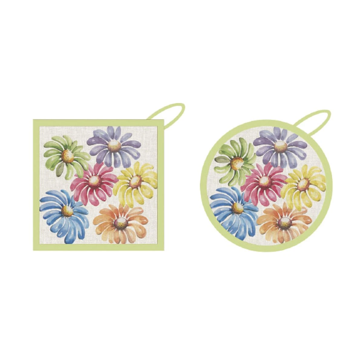 Ai fornelli la donna ha bisogno del suo grembiule e delle sue presine in coordinato. Il set Iole è perfetto per chi ama i fiori e il colore in casa, soprattutto in cucina.