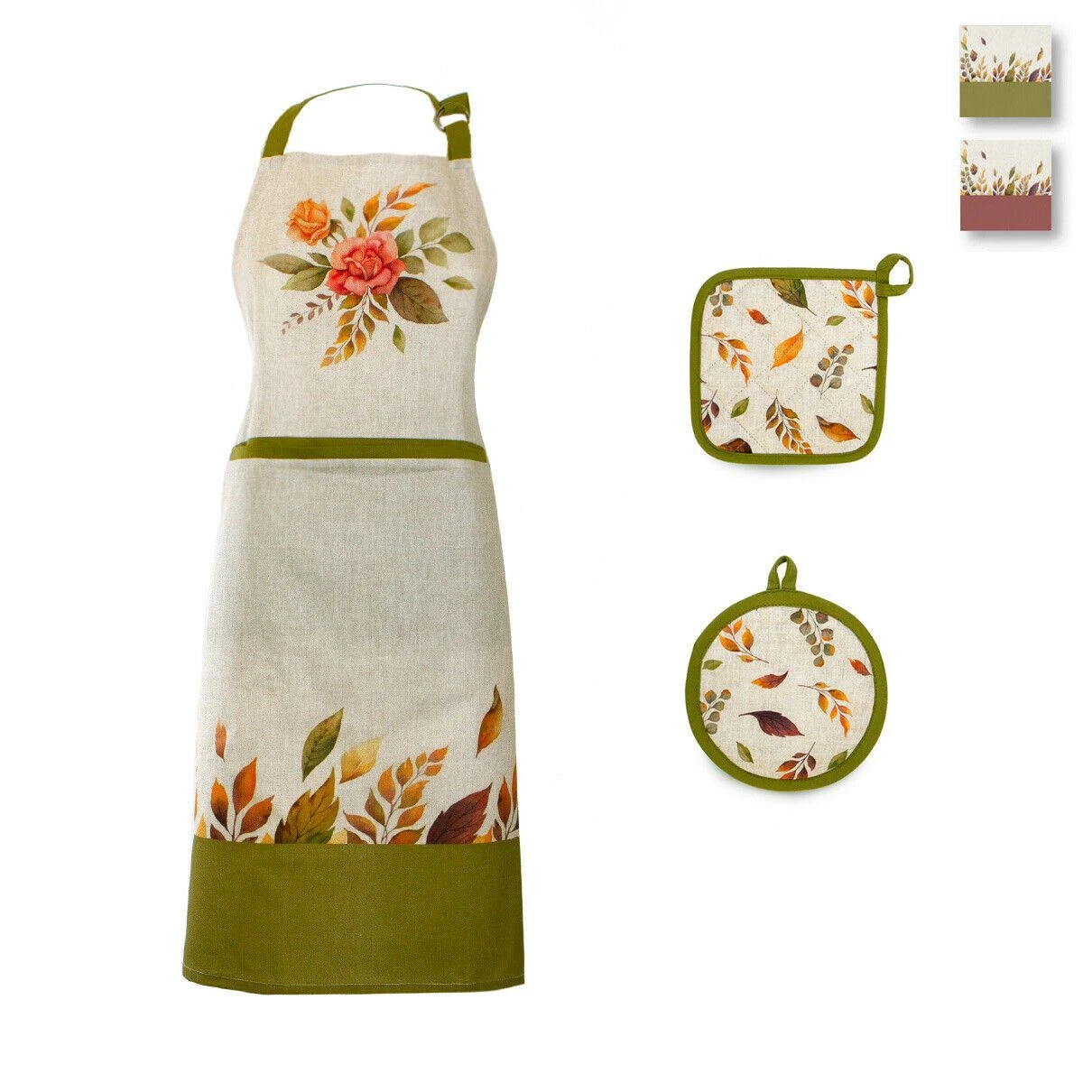 | Dettagli | La confezione comprende un set da cucina composto da: 1 presina forma quadrata 1 presina forma rotonda 1 grembiule Presine dotate di appendino Grembiule con ampia tasca anteriore e laccetti Stampa digitale con foglie autunnali Puro cotone, resistente ai numerosi lavaggi Coordinabile con altri articoli Disegnato e progettato in Italia |
