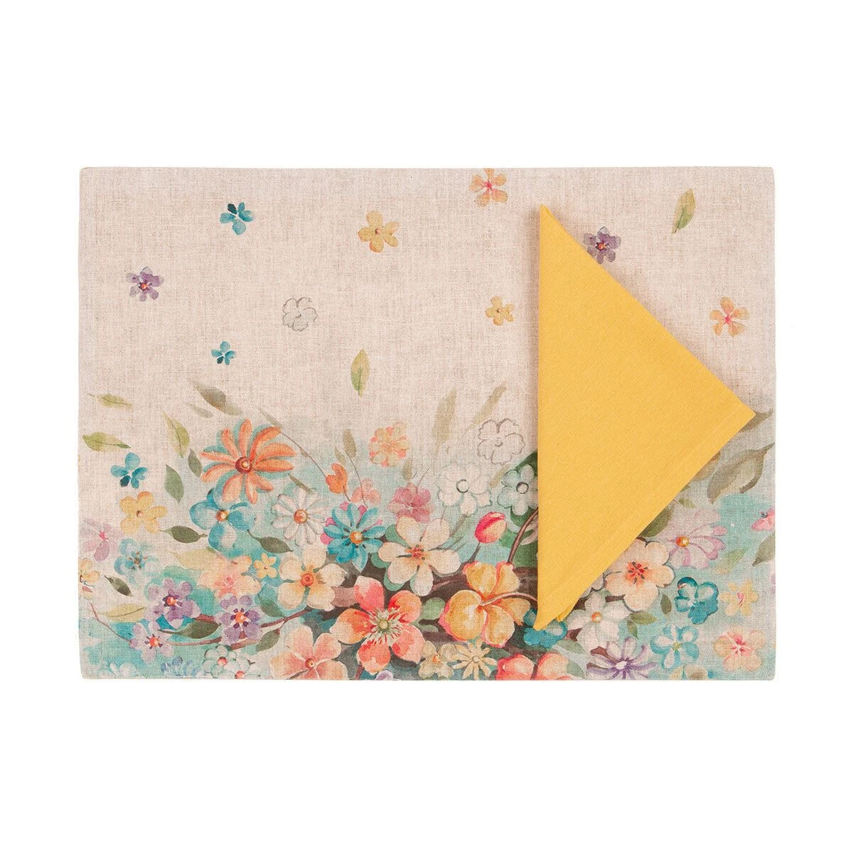 Un tripudio di fiori di diversa forma e colore sono stampati ad alta definizione sulla tovaglietta all’americana Flora realizzata in puro cotone. Presenta in coordinato anche un tovagliolo giallo in tinta unita, così come il retro della tovaglietta.