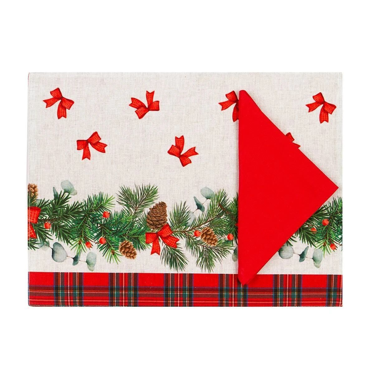 | Dettagli | La confezione contiene un set americano composto da: 1 tovaglietta all’americana 1 tovagliolo Motivo natalizio con fiocchi e decorazioni Motivo Tartan sui bordi Tovagliolo di colore rosso Stampa digitale ad alta definizione Adatto come decorazione di Natale Disegnato e progettato in Italia |