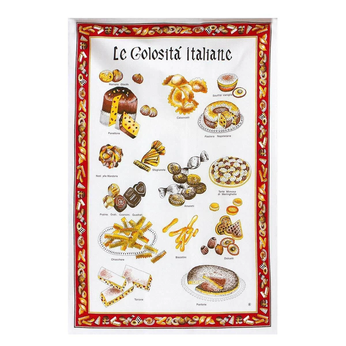 I dolci sono sicuramente tra gli alimenti più amati in cucina, al cioccolato, alla frutta, al pistacchio o semplicemente classico ogni luogo ha la sua specialità. Questo strofinaccio raffigura vari dolci classici italiani.