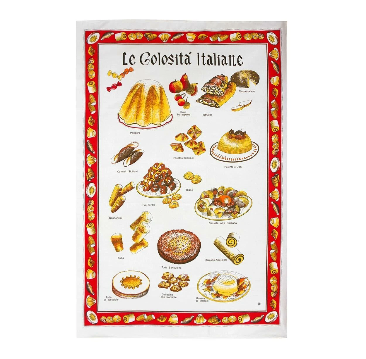 | Dettagli | La confezione contiene uno strofinaccio da cucina Forma rettangolare Stampa di vari dolci italiani Bordo perimetrale in contrasto di colore Retro in tinta unita Colori solidi al lavaggio Puro cotone di elevata qualità, compatto e resistente Made in Italy |