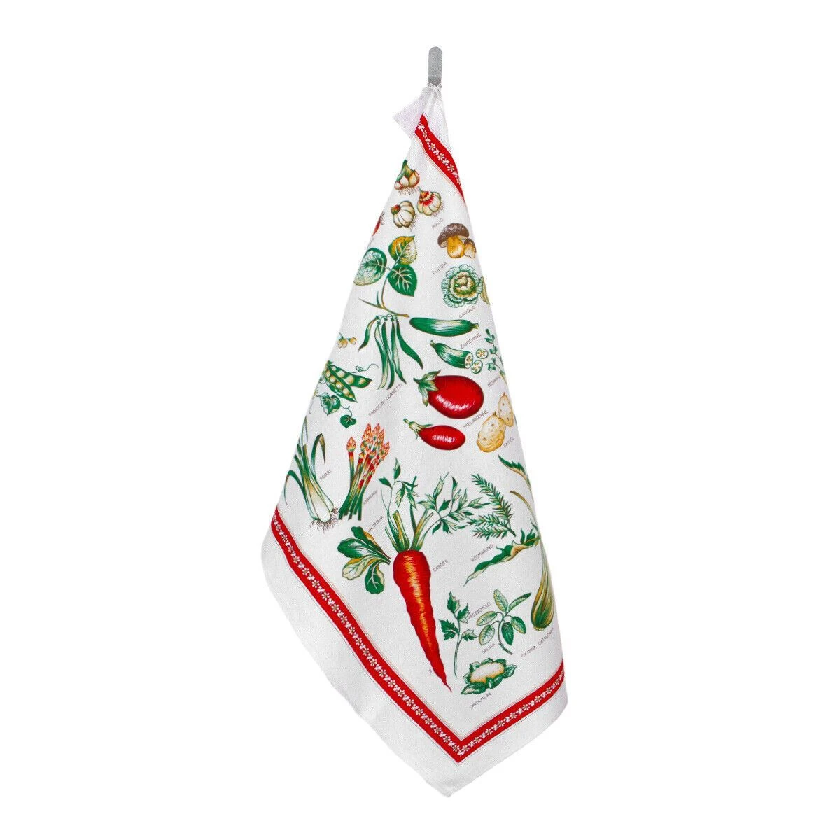 | Dettagli | La confezione contiene uno strofinaccio da cucina Forma rettangolare Stampa delle verdure Bordo perimetrale in contrasto di colore Retro in tinta unita Colori solidi al lavaggio Puro cotone di elevata qualità, compatto e resistente Made in Italy |