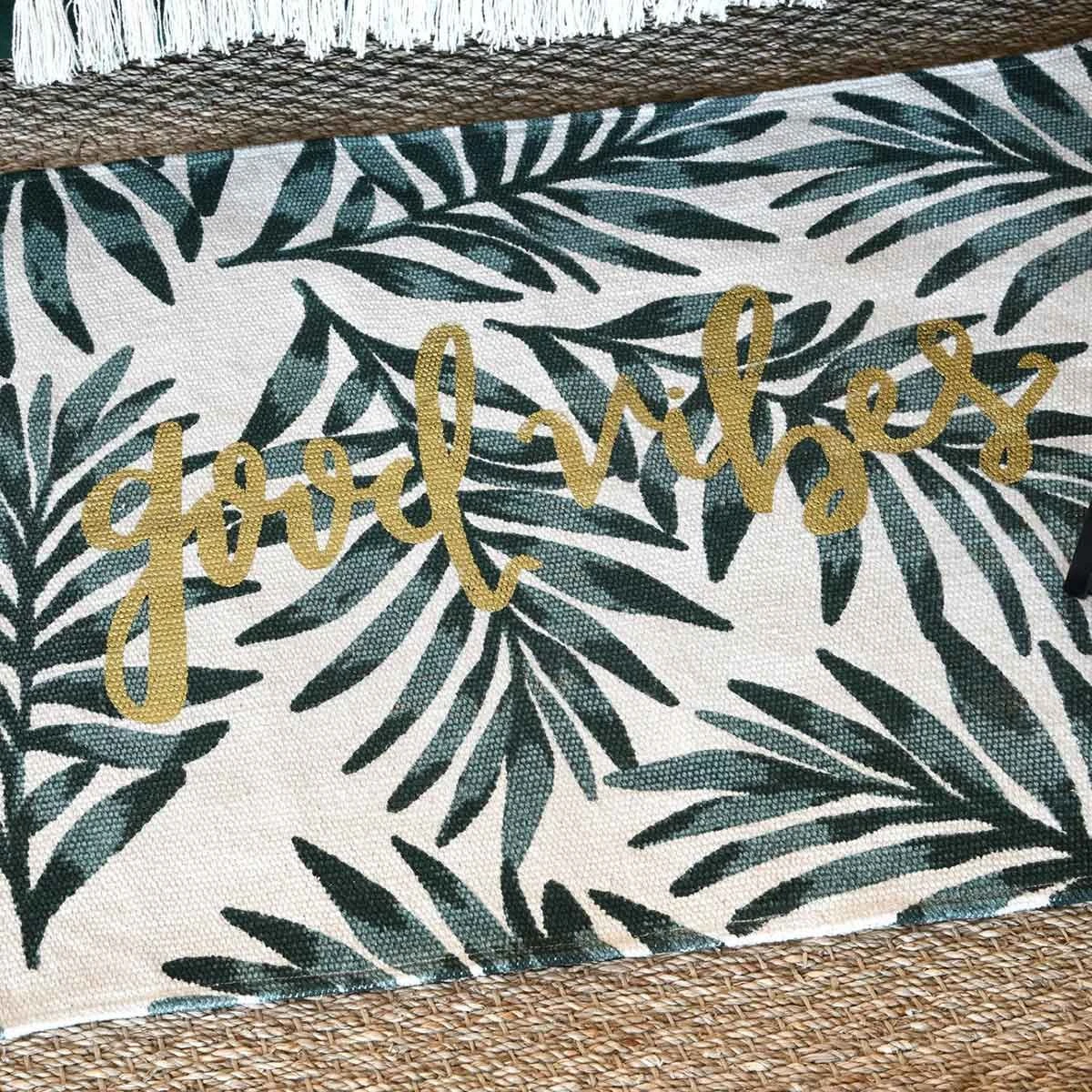 | Dettagli | La confezione contiene un tappeto Forma rettangolare Motivo jungle con stampa “Good Vibes” Tappeto multiuso adatto per cucina, bagno, ingresso, corridoio, camera |