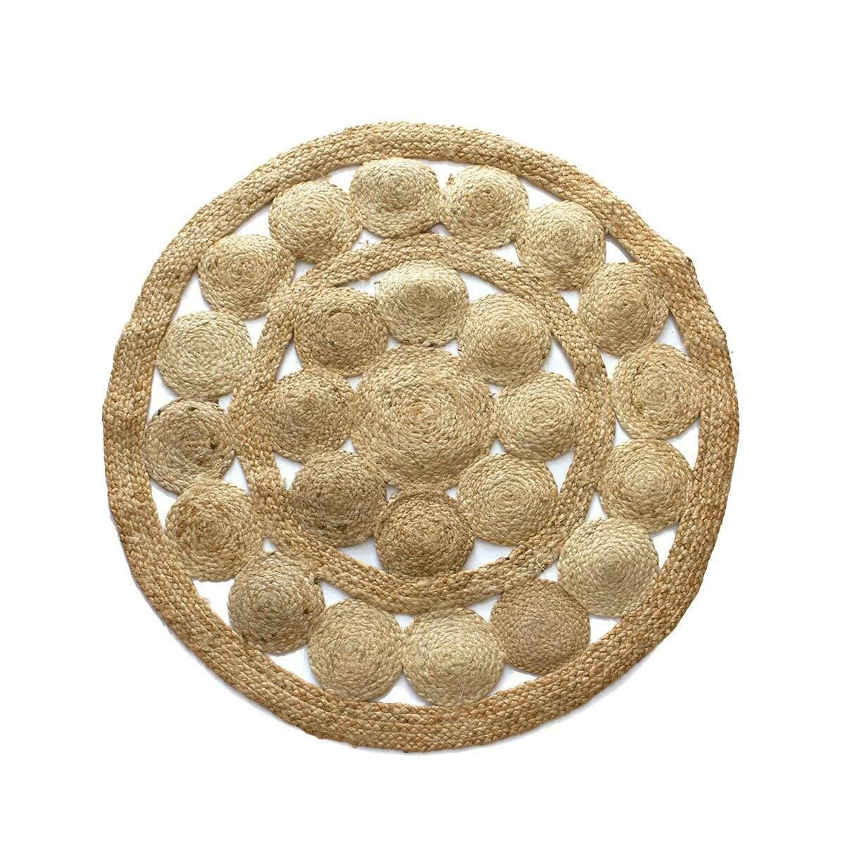 | Dettagli | La confezione comprende un tappeto in juta naturale intrecciata Motivi circolari Forma rotonda Ideale per ambienti rustici |