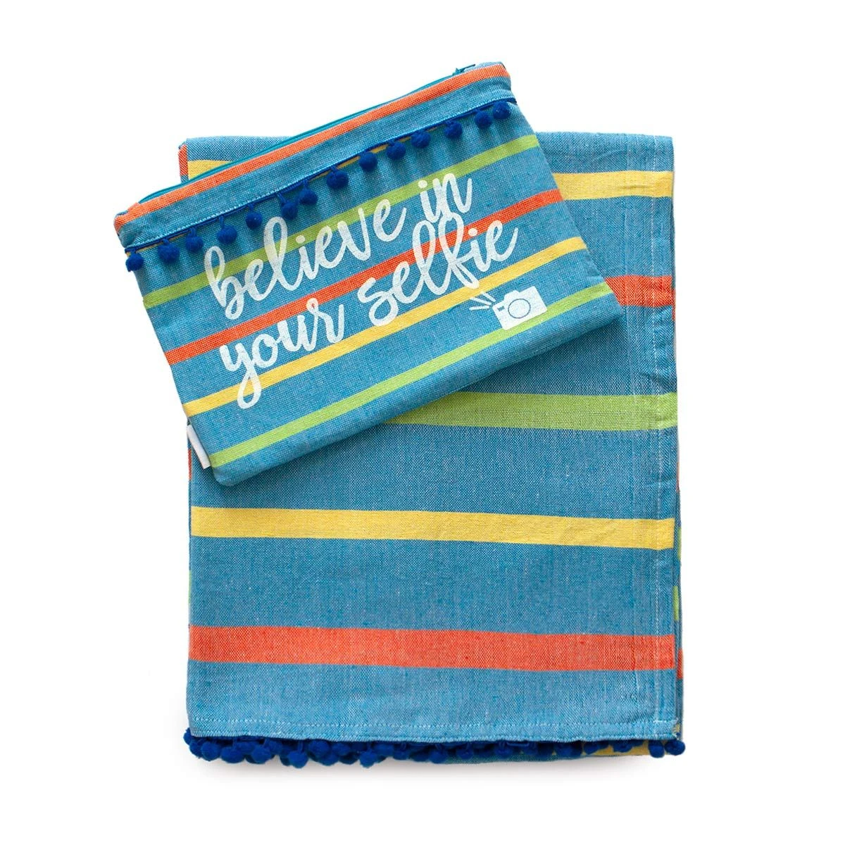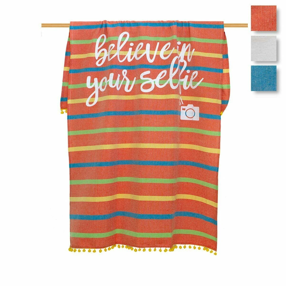 Questo telo mare, con i suoi colori brillandi ed audaci ed il simpatico gioco di parole ci incita a fare un “selfie”, un autoscatto, ed a credere sempre in noi stessi, cosa che una foto venuta bene può aiutarci a fare. Compatto e dal minimo ingombro sarà il must have dell’estate.