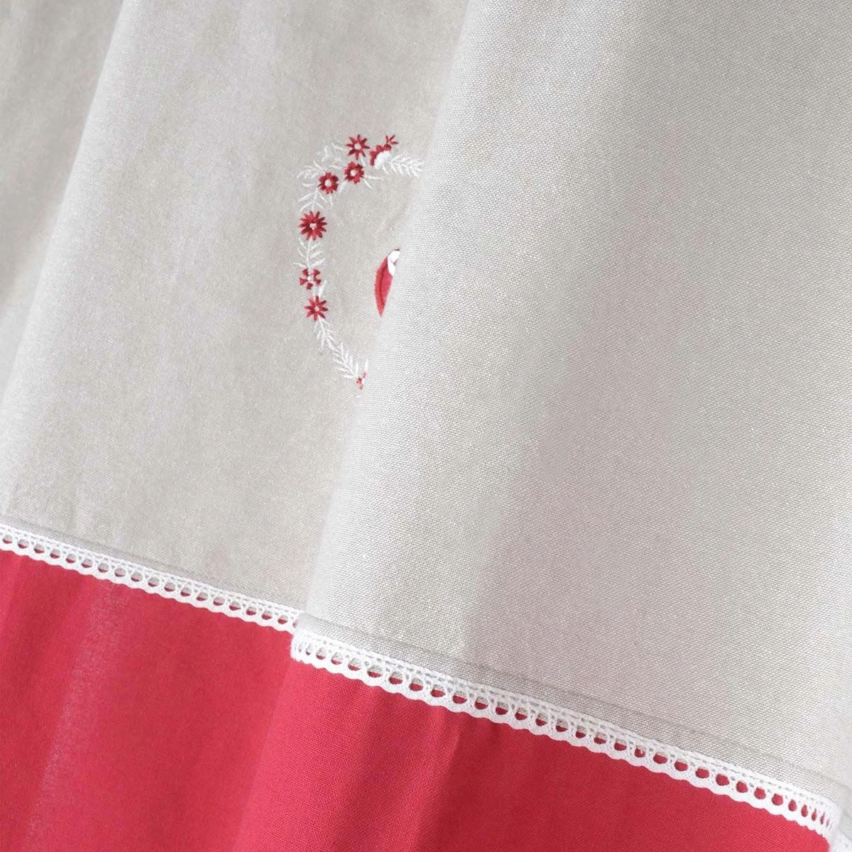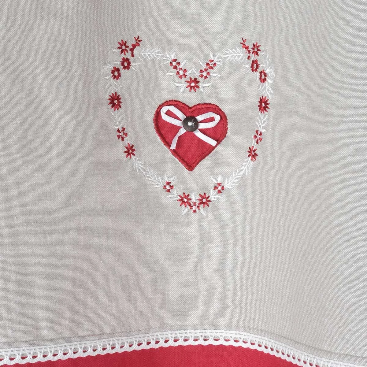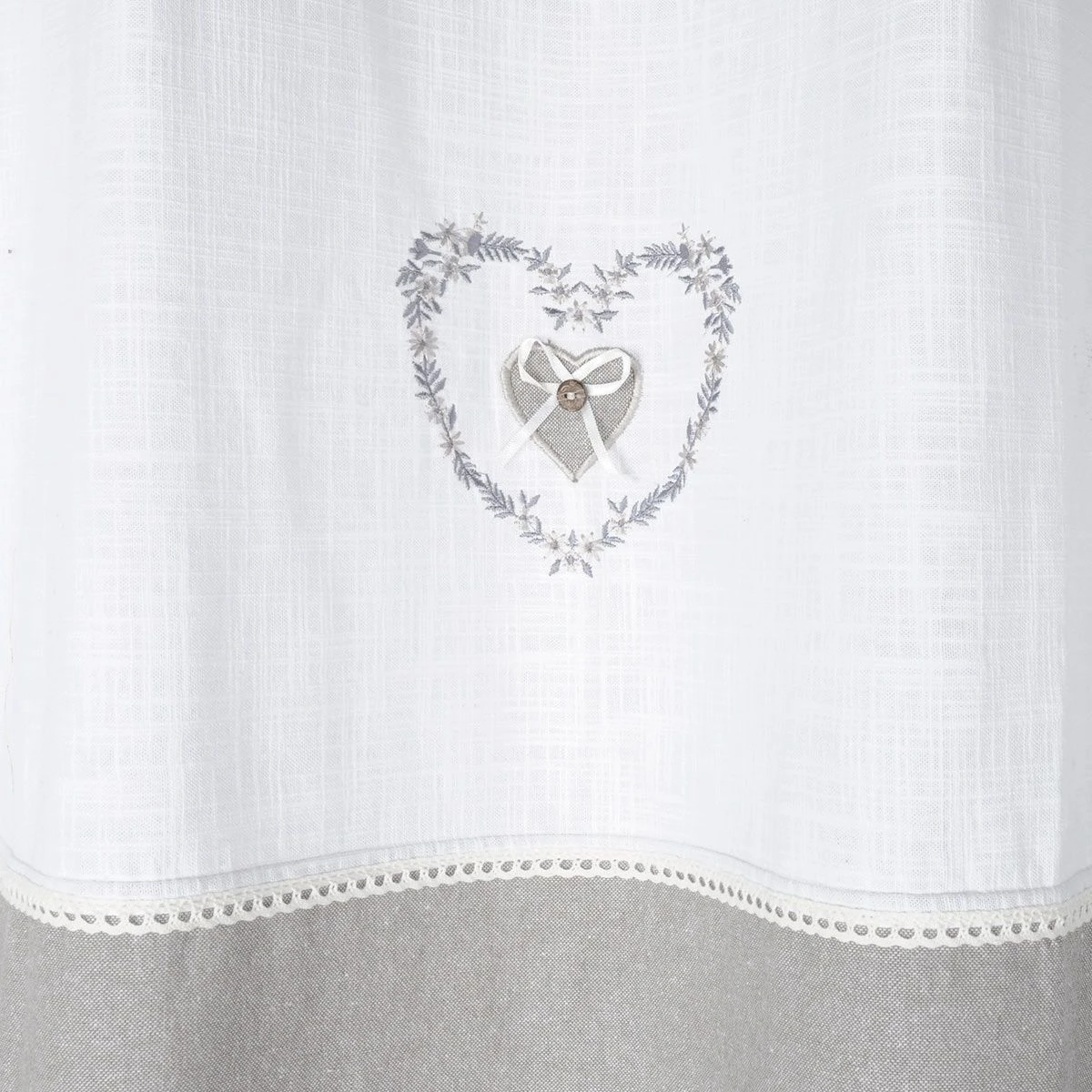 | Dettagli | La confezione contiene una tenda a pannello Stile shabby, country e romantico con cuore ricamato centralmente e inserto in passamaneria Tessuto coprente che blocca il passaggio dei raggi solari e protegge dagli sguardi esterni tutelando la privacy Tenda confezionata con 8 anelli (borchie) metallici di colore bronzo Diametro interno borchia 45 mm Completamente rifinita, pronta per essere montata Coordinabile con altri articoli |