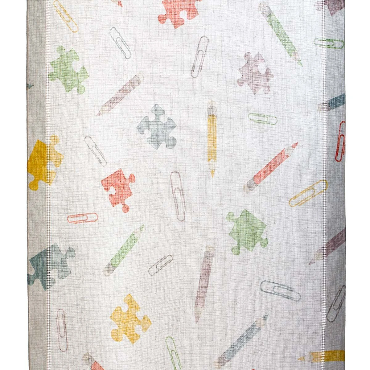 Matite, graffette e pezzi di puzzle colorati sono il tema del tessuto per tendine a vetro. Vivace e originale sarà l’ideale per gli spazi dei bambini e grazie alla sua semitrasparenza la stanza sarà illuminata al punto giusto.