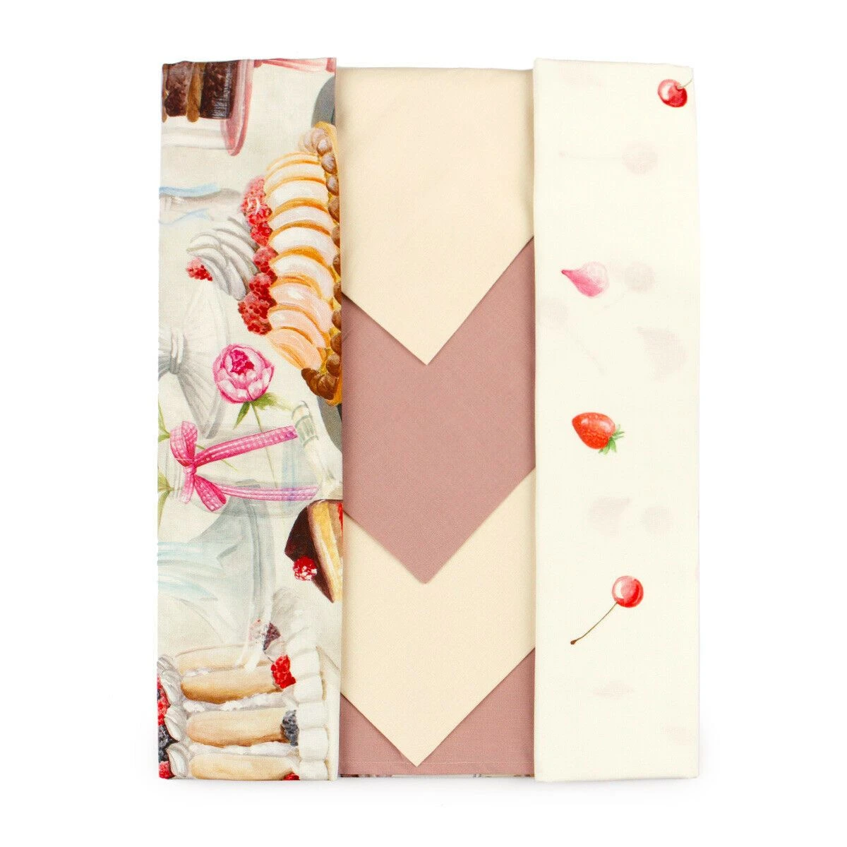 Anche dopo un pasto abbondante c’è sempre spazio per il dessert, proprio quello di cui vi farà venire voglia la tovaglia Pasticceria di Maestri Cotonieri, inclusa di tovaglioli, che raffigura tanti tipi di torte e dolci.
