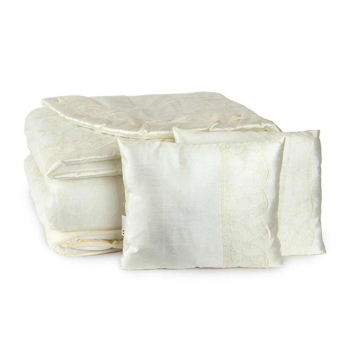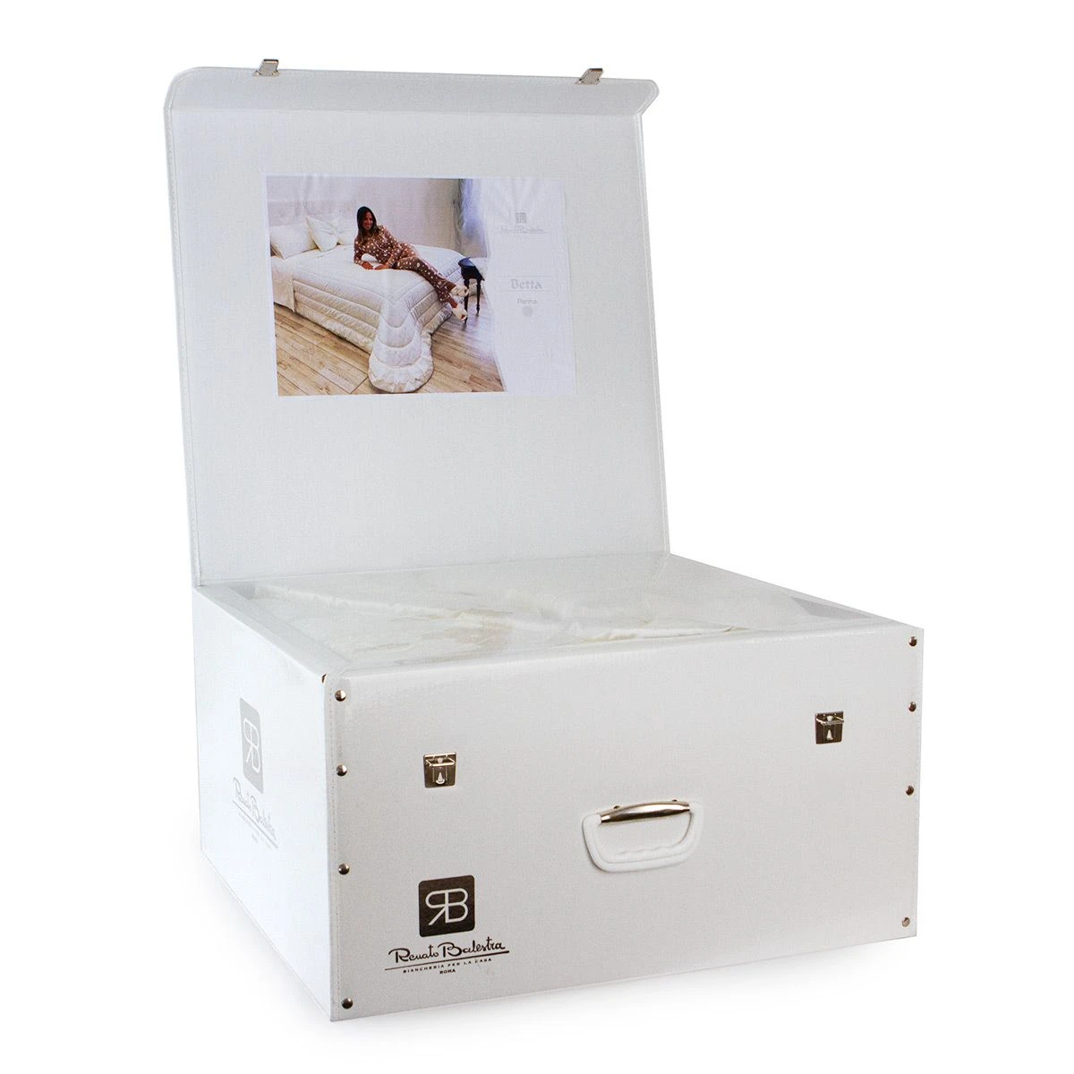 | Dettagli | La confezione comprende una trapunta invernale matrimoniale Due cuscini arredo rettangolari Bordo perimetrale con pizzi Retro in tinta unita Peso imbottitura: 350 gr/mq Soffice e calda, ideale per il freddo invernale Confezionata in un’elegante scatola con manico Ottima come idea regalo oppure per il corredo Made in Italy |